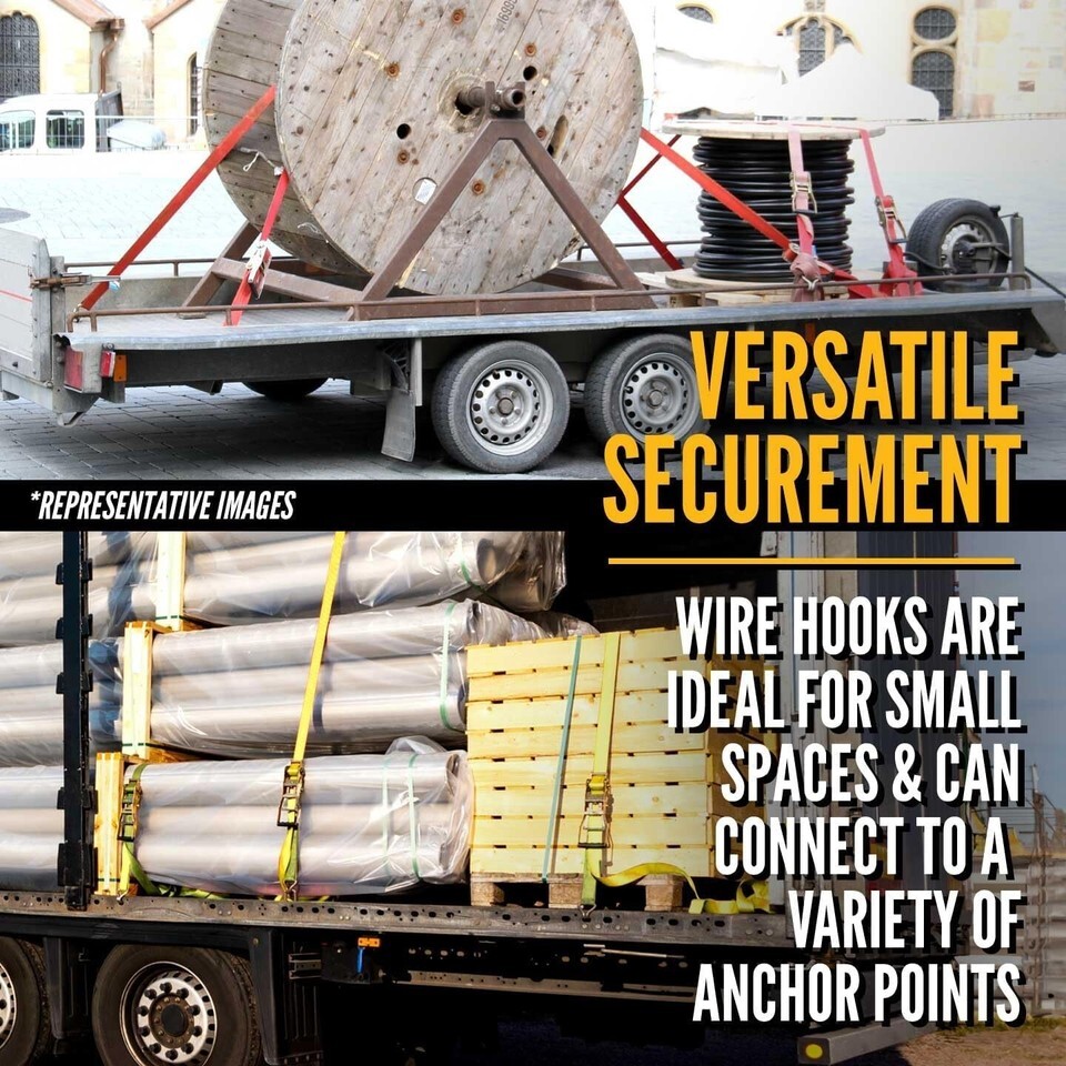 HIGH STRENGTH WIRE HOOK - Our heavy duty ratchet straps feature a wide, zinc-coated ratchet handle and fitted with two (2) wire double J hooks for added strength and the ability to easily attach to multiple anchor points on trucks or trailers.