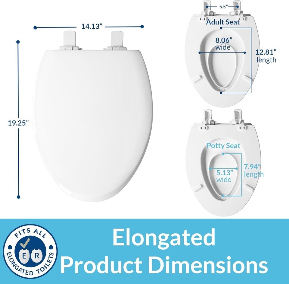 Featuring a ready to use built-in potty seat this innovative seat is ideal for your home. The potty seat automatically secures by a magnet into the recess in the molded wood cover, eliminating the need for the adult user to manually lift the child potty seat. When no longer needed, the potty seat portion can be easily and permanently removed, leaving the adult toilet seat in place. This toilet seat uses Whisper Close technology that allows the seat and lid to close slowly and quietly with no slamming or pinched fingers. The seat is can be adjusted front to back up to 1/2 inch for a perfect, flush fit with your toilet bowl and is easy to remove for cleaning and with Easy Clean hinges. With the innovative STAY-TITE Seat Fastening System, the seat does not shift around and stays firmly attached to the toilet bowl. This seat is proudly made in Sheboygan Falls, Wisconsin, USA and fits all manufacturers' round bowls in the US and Canada. When no longer needed, the potty seat portion can be easily and permanently removed. NOTE: Colors on a website or printed from a website can vary drastically from the actual color of the toilet seat due to monitor and printer settings. The colors on this page are for approximate visual use and should not be used to match colors exactly to a toilet bowl.
