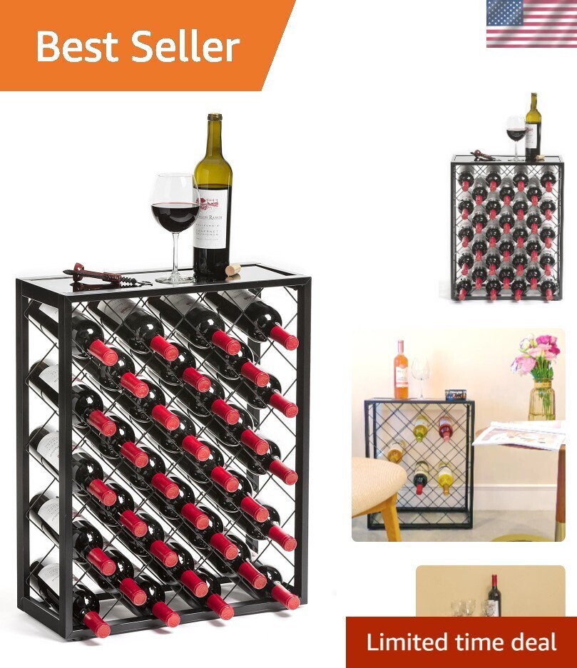 Elegant 32-Bottle Wine Rack with Black Glass Top Shelf - Free Standing Design