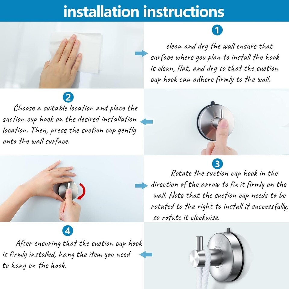 Bathroom hook modern is easy to install it, press glass shower towel hook firmly to the wall and twist the knob cap by hands to finish installation, wash the bathroom shower hooks suction cup bottom and use the hairdryer to dry reuse, after move small suction cup hooks for windows to anywhere you want.