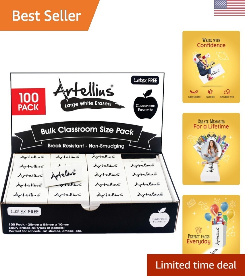 White Erasers Pack of 100 - Large Size Latex Smudge Free for Art Classrooms, Drawing, Teachers, Homeschool, and More!