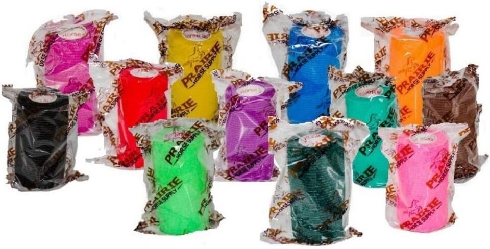 Vet Wrap Tape bandages are known around the world as the preferred self-adherent bandaging tape for dogs, cats, small and large pets, and horses. Each roll is individually Wrapped. Our self stick Vet Tape is a must have first aid supply, stock up with some fun new colors. Our vetWrap is easy to cut or tear, and a wonderful all-around medical Wrap. These elastic bandages are strong and provide excellent support. The bandage applies pressure to inhibit bleeding. It is also flexible enough and when used properly with padding or gauze it will not cut off circulation. Veterinarians find one of the most exciting features is that the vet Wrap tape sticks to itself so no clips or fasteners are needed. 2, 3 or 4 inches Wide x 5 yards Long when stretched. (6 Rolls, 12 Rolls, 18 Rolls, or 24 Rolls) - Color choices: Black, Blue, Brown, Camo, Fuchsia, Hunter Green, Neon Green, Neon Pink, Orange, Purple, Red, Teal, White, Yellow, Paw Prints, Smile and Heart Patterns or Assorted Colors