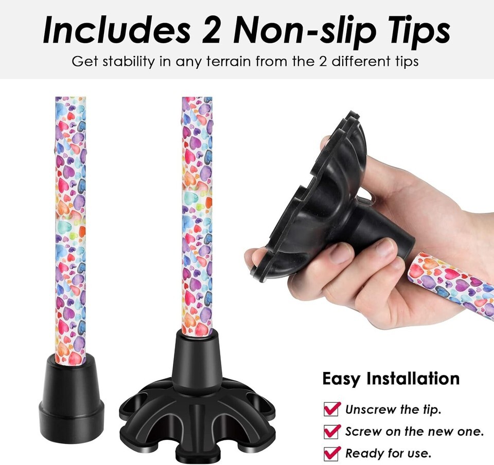 Featuring replaceable foot covers, a non-slip tip, and an easy grip handle, our walking cane ensures safe and secure walking with every step. Plus, its lightweight and portable design make it easy to take with you wherever you go.