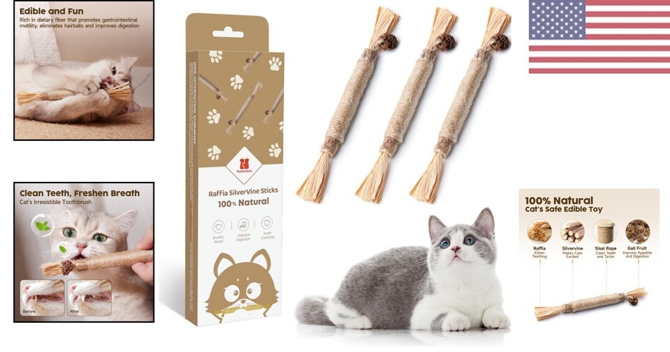 Give your furry friend the best with our Bite-Resistant Silvervine Sticks. Made from 100% natural ingredients, these sticks are not only safe for your cat to chew and bite, but they also provide numerous benefits such as promoting dental health, relieving stress, and keeping your cat active and entertained.