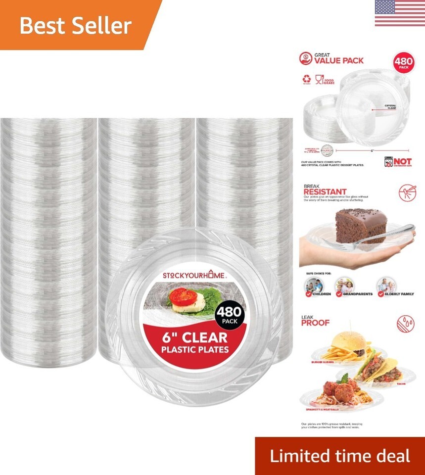 Great Value Pack: Our value pack comes with 480 crystal clear plastic dessert plates. Our plates measure approximately 6? Diameter x ? Height. Our plates are meant to be disposed of after use. *Not dishwasher safe.