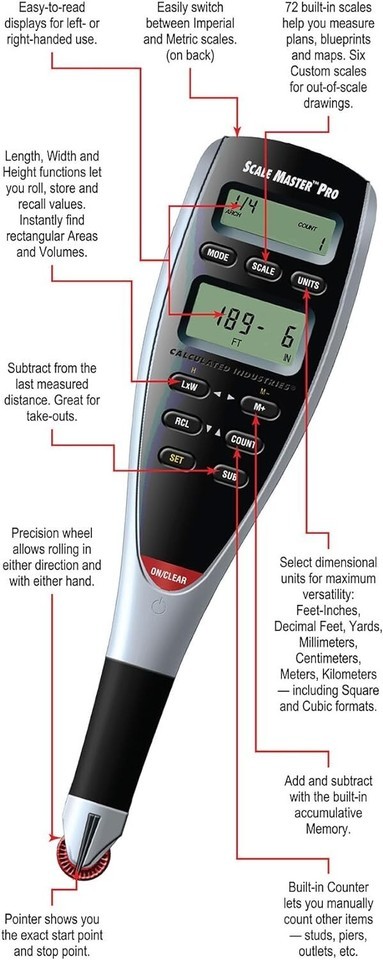 " Scale Master Pro Digital Plan Measure and Takeoff Tool for Printed Plans gets fast, accurate linear, area and volume takeoffs from blueprints, drawings and maps.PERFECT FOR architects, project managers, estimators and contractors in all aspects of design and construction. Anyone that works off of printed plans in the office or on the jobsite.SPECIFICALLY DESIGNED TO SIMPLIFY TAKEOFFS AND ESTIMATING from architectural and engineering drawings. It finds linear measurements, rectangular areas, and volumes as well as converts between scales and IN ANY BUILDING SCALE AND MOST DIMENSIONAL UNITS the Scale Master Pro comes with 72 built-in scales (39 imperial and 33 metric for versatility). It also features six custom scales (three each for imperial and metric units), enabling you to define any scale, even out-of-scale plans or PDFs of Autocad or digital plans that are ed in small file TIME SAVING FUNCTIONS include accumulating memory; dedicated length, width, and height keys; push-button counter to count items while rolling; a switch to lock in mode, scale, and units while rolling the wheel; and a subtract key that allows you to deduct rolled COMPLETE with easy to follow User?s Guide, two long-life CR-2032 batteries, protective hard case and 1- .Scale Master Pro has an auto shut-off feature that turns the device off after 4 to 6 minutes of non-use. After powering back on, all registers and settings remain intact including all temporary registers. Scale Master Pro measures x x inches, weighs waste time with old fashioned triangle scale rulers or costly ?guess-timating?? Click Add to Cart to get your Scale Master Pro today!Copyright 2019 . All rights reserved. " .com Get fast, accurate linear, area and volume takeoffs from blueprints, drawings, and maps with the Scale Master Pro digital plan measure (model ) from . It's ideal for contractors, landscapers, fencing specialists, plumbers, and anyone needing fast, accurate takeoffs from plans and fast, accurate linear, area, and volume takeoffs from blueprints, drawings and maps (view larger). Specifically designed to simplify takeoffs from architectural and engineering drawings, it finds linear measurements of any shape--as well as rectangular areas and volumes--and it converts between scales and dimensions. The Scale Master Pro comes with 72 built-in scales (39 imperial and 33 metric for maximum versatility). It also features six custom scales (three each for imperial and metric units), enabling you to define any scale, even from plans that have been reduced, enlarged, or are just out of scale. You can easily store the new scale permanently into the device for future use. Other features include two built-in memories; dedicated length, width, and height keys; push-button counter to keep track of items while rolling; switch for locking in mode, scale, and units while rolling; and a subtract key that allows you to deduct rolled 's powered by two CR2032 lithium batteries, and the Scale Master Pro has an auto shut-off feature that turns the device off after about 4 to 6 minutes of non-use. After powering back on, all registers and settings remain intact, including all temporary registers. The Scale Master Pro measures x x inches, weighs ounces, and is backed by a one- .What's in the Box Scale Master Pro digital plan measure; hard cover protective case; user guide; batteries Scale Master Pro Digital Plan Measure