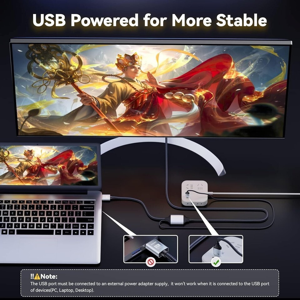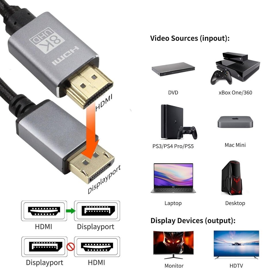 Important Information: 1. Unidirectional HDMI to Displayport 1) The HDMI to Displayport cable is not a Bi-direction cable, it works only from HDMI in to Displayport out. 2) You can not connect a PC or laptop with a Displayport to a monitor or HDTV with an HDMI port. 2. Standard HDTV resolutions only This HDMI to Displayport cable supports only Standard HDTV resolutions input and out such as 1080@ 3. External power supply needed External 5V 1A and above power supply is always needed. Please connect the USB plug of the cable to the 5V external power supply (a 5V power adapter is not included). 4. Not work with VRR, VR, Headset, DP extension cable This HDMI to Displayport cable won't accept 2nd conversion. The HDMI plug of this cable must be inserted into the HDMI port of the video source directly. Please DO NOT connect the HDMI plug and Displayport Plug to any other video devices such as docking station, video capture, switcher, KVM, splitter, HDMI extension cable, and Displayport adapter or extension cable, that won't work.