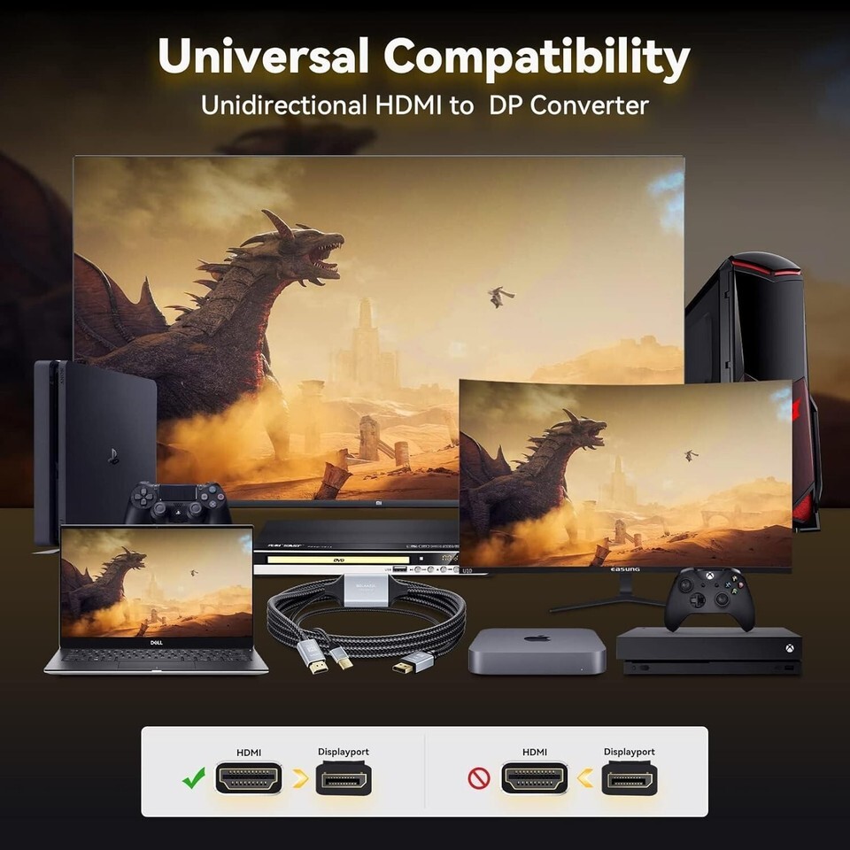 Unidirectional Transmission: Only support from HDMI source to DisplayPort display/monitor, not work from DP to HDMI