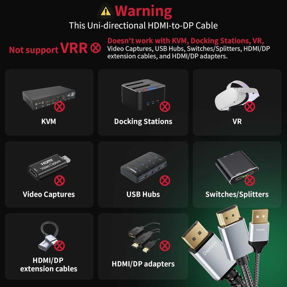 Important Note: 1)NO VRR. This HDMI input to Displayport output cable won't accept 2nd conversion. Not working with VR headset, docking station, video capture, switcher/splitter, KVM, and HDMI/Displayport adapter/extension cable. 2)The HDMI to Displayport out converter cable is a bypass cable. It cannot downscale or upscale, the resolutions and refresh rates