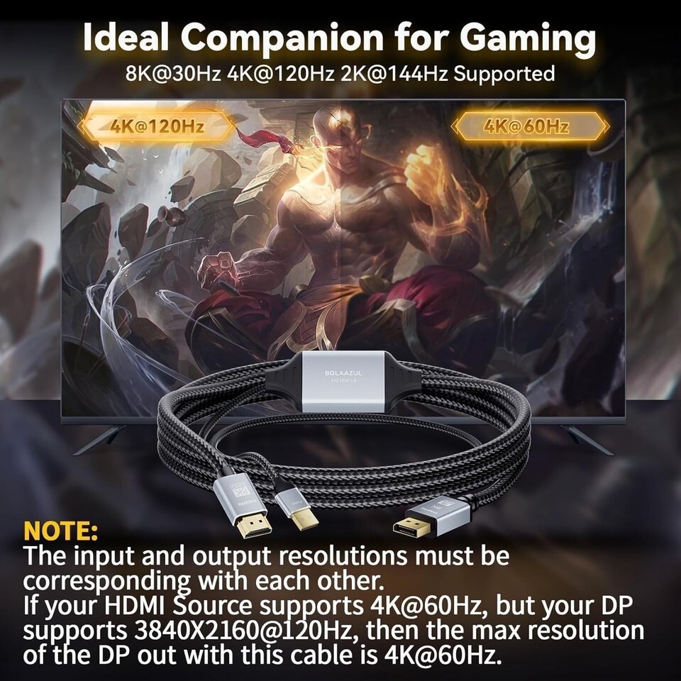 For Xbox Series X/(S) Users: 3) To get 4K/120Hz and 2K/144Hz(for 8K 30Hz model only), the HDMI input must of HDMI and capable of supporting 8K/30Hz,4K/120Hz and 2K/144Hz. The DisplayPort of your monitor must support that too. CAUTION: Unidirectional HDMI in to DP out converter cable, only supports converting the signal from HDMI source to DisplayPort out