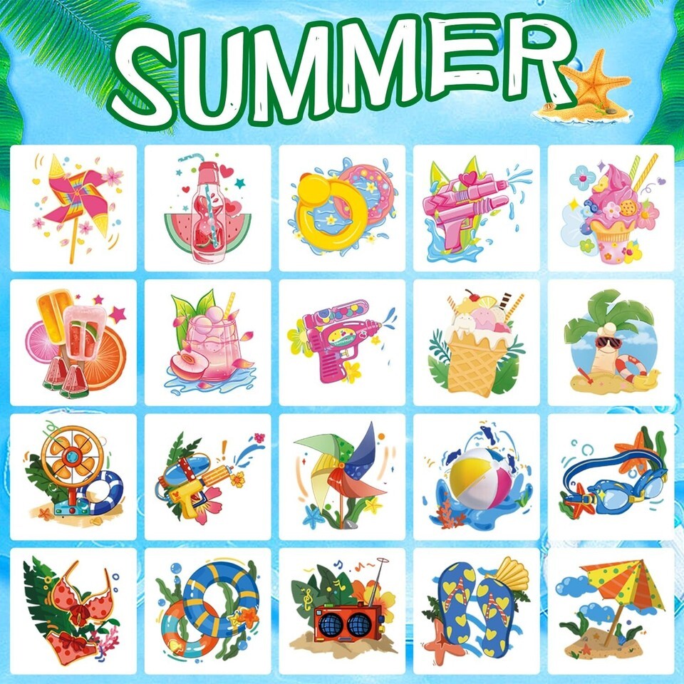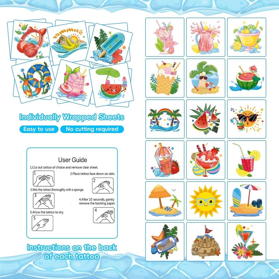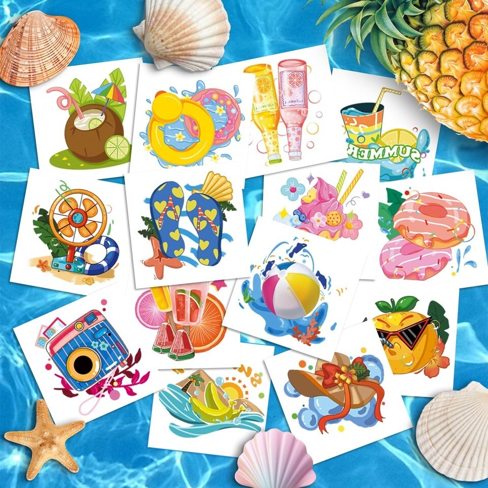 Summer decorations: Hawaiian temporary tattoos have 408 PCS patterns, including coconut, watermelon, ice cream, coconut tree, sunlight, fans, swimming circles, flip flops, castles, donuts, ice cream, strawberries, juice, sunshades, and other cool 's perfect for a summer .