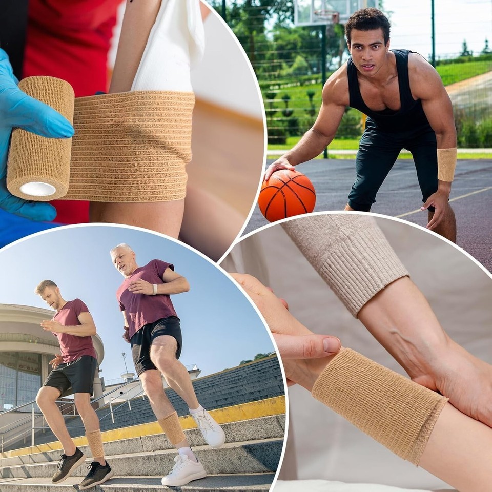 Soft and Breathable: Bandage wraps are made of porous non-woven fabric, they are soft, lightweight, highly elastic, breathable and harmless to the skin. Strong self-adherent tapes provide support and protection for injuries without compromising comfort; The wrap has good tensile strength that ensures it doesn't break or tear easily
