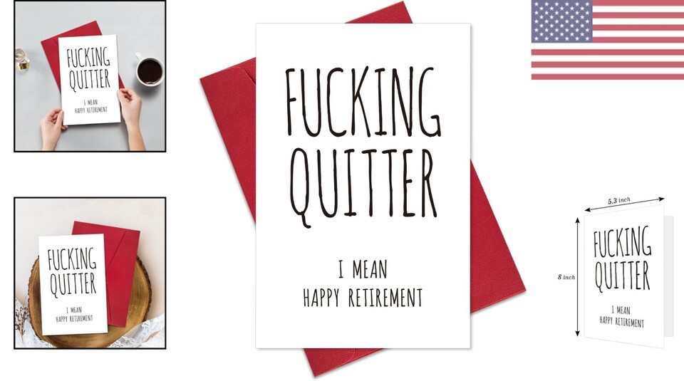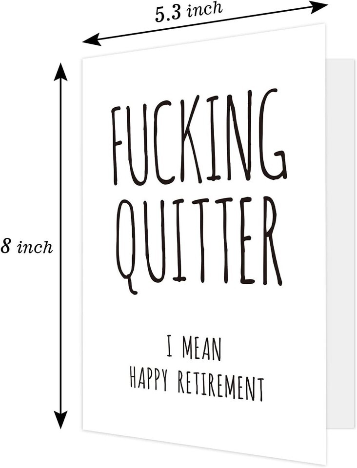 Make your loved one's retirement day even more special with our Funny Quitter! I Mean Happy Retirement card. With its high-quality card stock, matching envelope, and blank inside for your personal message, this card is the perfect way to celebrate this milestone. Bring laughter and joy to the retiree with our unique and humorous design. Order now and make their retirement day unforgettable!