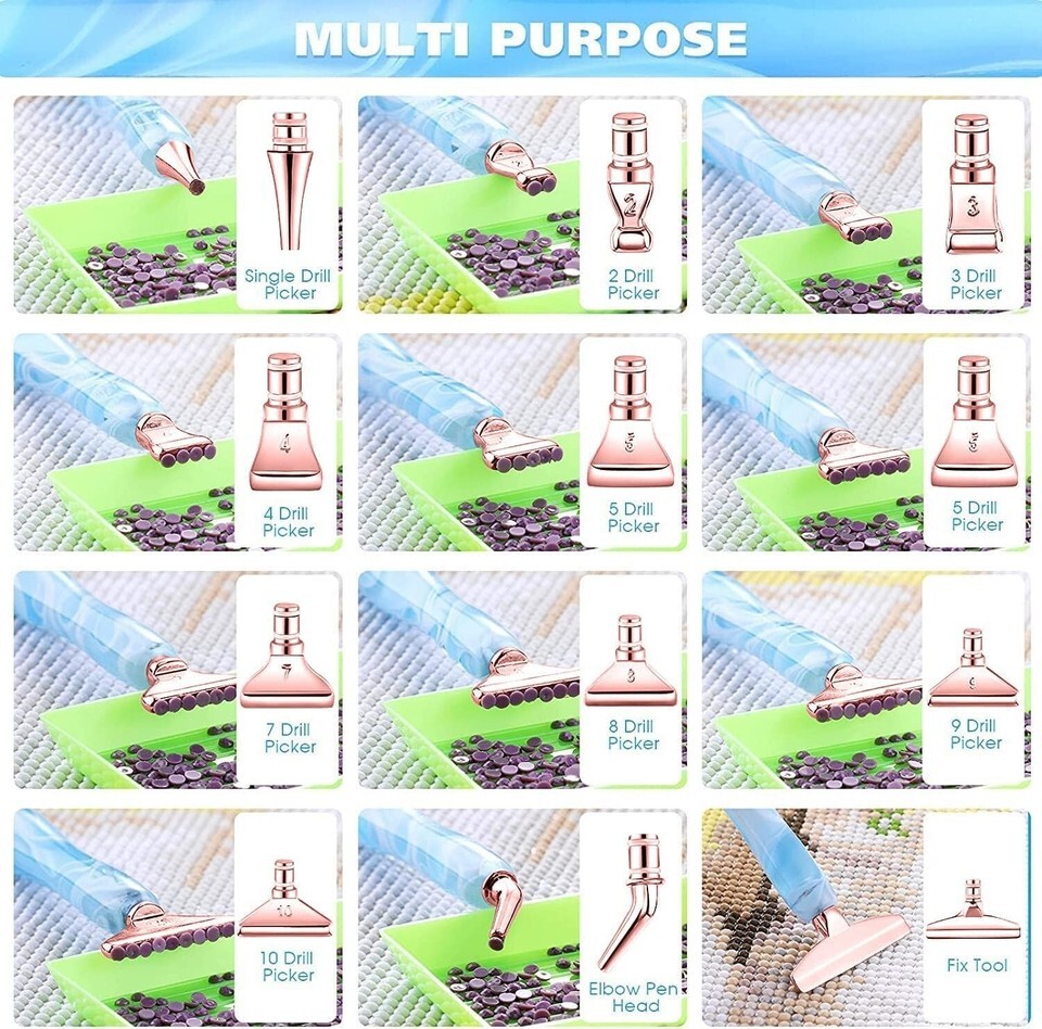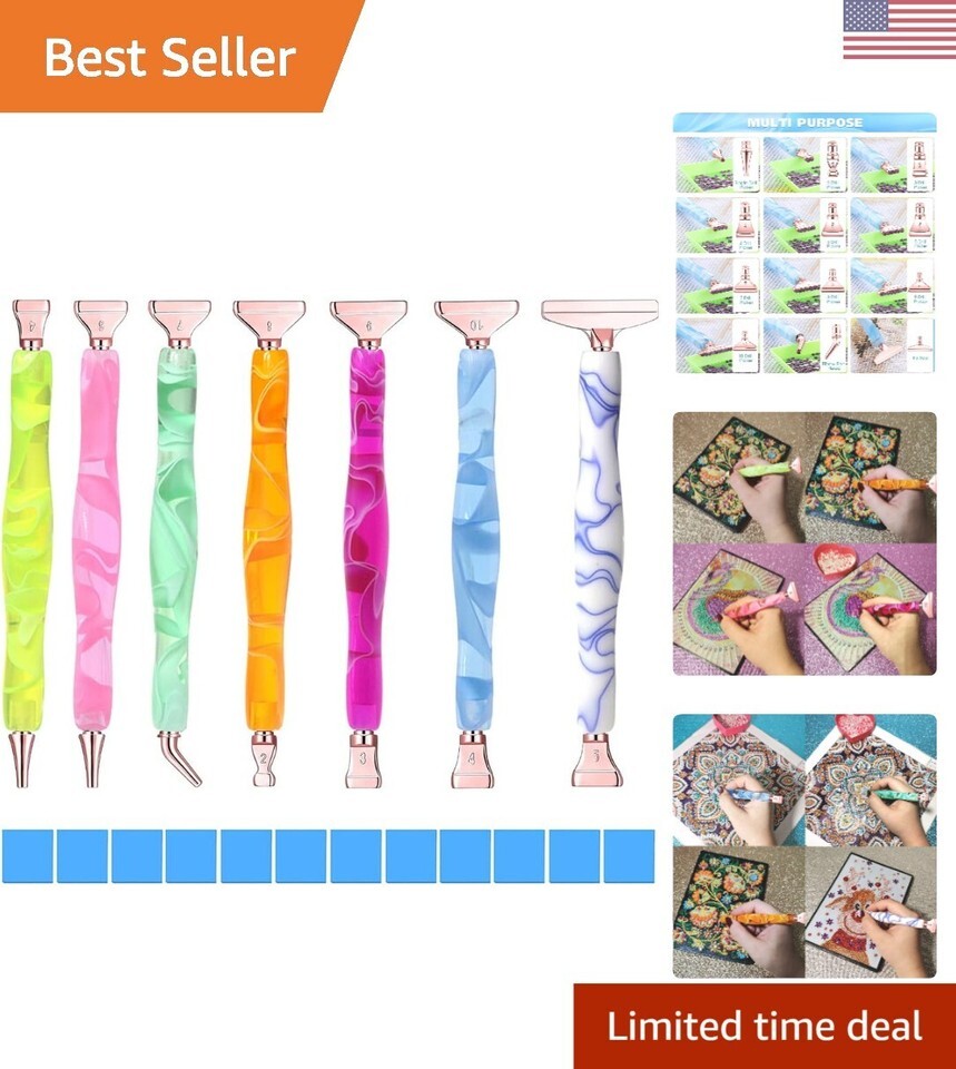 Features: Our Imaginative Diamond Painting Pen is comfortable to hold, drilling speed up to 2 times faster than regular stylus pen. It can help you complete the 5D diamond painting kit much more easily and faster. 1 Tips : All the placers we send you are interchangeable both ends of the stylus, Just screw in and screw out the tips. If it is too tight please remove the rubber O-rings. If it is loose, please put on the rubber O-rings. 2 Especially the paintings that use symbols that are similar! So our specially 1 bead angled tips are very helpful. The bend in the pen lets you see exactly where it needs to be placed. 3 Our diamond art pen just the right length and its durable! You can diamond paint for hours with no hand cramping at all. 4 Our diamond art pen can pick up all kinds of diamonds, like round drill, square drill, crystal drill Specification : Material of Diamond painting pen: handmade resin and the acrylic curves. Material of Diamond Painting Pen Multi Placer: stainless steel, strong and durable, not easy to break Material of Diamond Painting Clay: quality silicon (Note: not for children under 3 s old; Adult supervision required) Drill Pen Color: All 7 colors NeonYellow, MintGreen, LtBlue, Purple,LtPink,WhiteBlue,Orange Diamond art pen Size (Length)"/12cm Diamond art pen Weight per piece: Diamond Painting Pen Kit include : 7PC Double-ended drill pen 14PC x 13size rose gold metal Tip 12PC x "*" blue clays 1 pack of rubber rings