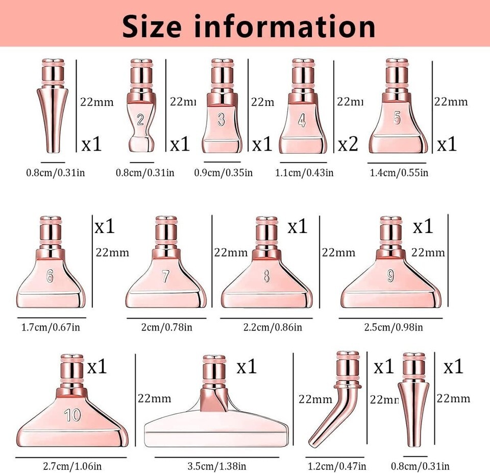 YOU WILL GET:7Pc Diamond painting pen, 14Pcs Rose Gold Stainless steel diamond painting pen metal nibs in different sizes,1 transparent placer storage box ,12 pieces bluewax clay and 1 pack of rubber rings