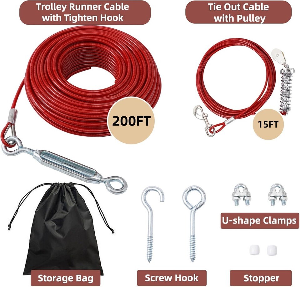 HEAVY DUTY DOG RUN: Give your energetic large dog (up to 250 lbs!) the freedom to roam your yard safely. Our 200 ft main cable and 15 ft dog tie out cable are crafted from corrosion-proof, vinyl-coated stainless steel ? built tough to withstand s of enthusiastic running and pulling