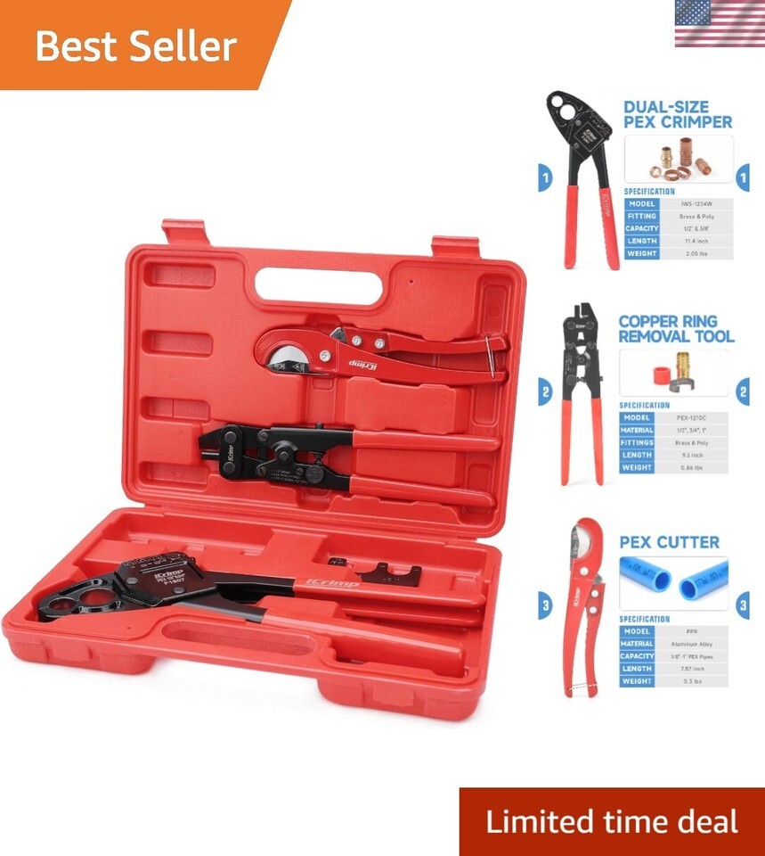 PEX Crimping Tool Kit for 1/2-in 3/4-in Copper Crimp Rings, with Dual Size PEX Crimper, PEX Removal Tool and PEX Pipe Cutter, Meets ASTM F1807 Standard