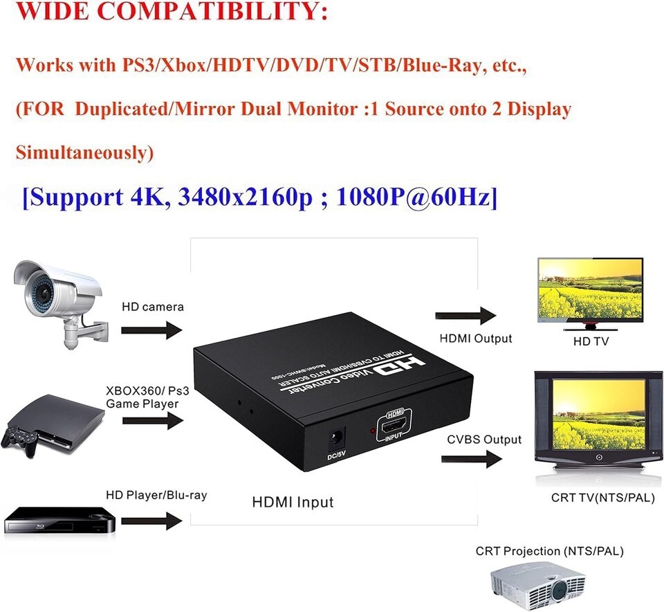 ?HDMI Input Format- Support 480P/576P/720P/1080p@60hz simultaneously compatible with DVI mode: 800x600/1024x768 / 1280x720/1280x1024/1920x1080/60hz; AV video output: 480i/576i (optional) ; Audio output: L/R channels ; Support the HDCP Protocol,support for HDMI Support play on TV,Compatible with VHS VCR,XBOX360,PS3,Set-top boxes, DVD recorders, your product does not work or there is no signal output, we suggest that you adjust the resolution of your input source to automatic
