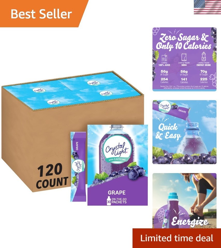 Naturally Flavored Grape On-the-Go Powdered Drink Mix with Caffeine is a deliciously fruity drink you can enjoy anywhere. With zero grams of sugar and 10 calories per packet, is a sweet alternative to juice and soda and has 90 percent fewer calories than leading beverages (this product is 10 calories, leading beverages are 130 calories), so you don't have to choose between taste and calories. Each packet also has 60 milligrams of caffeine so you can be at your best all day long. Each ounce individual packet in our 4 pack of 30 count boxes (120 packets total) of powdered fruit drink mix fits easily in your bag, desk or car, so you can enjoy a refreshing glass of anywhere. Simply empty one drink mix packet into a bottle of water or a glass with 2 cups of water, shake or stir, and enjoy! All the flavor and only 10 calories per packet, just the way you like it.
