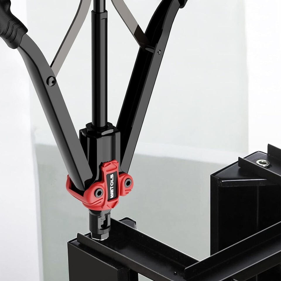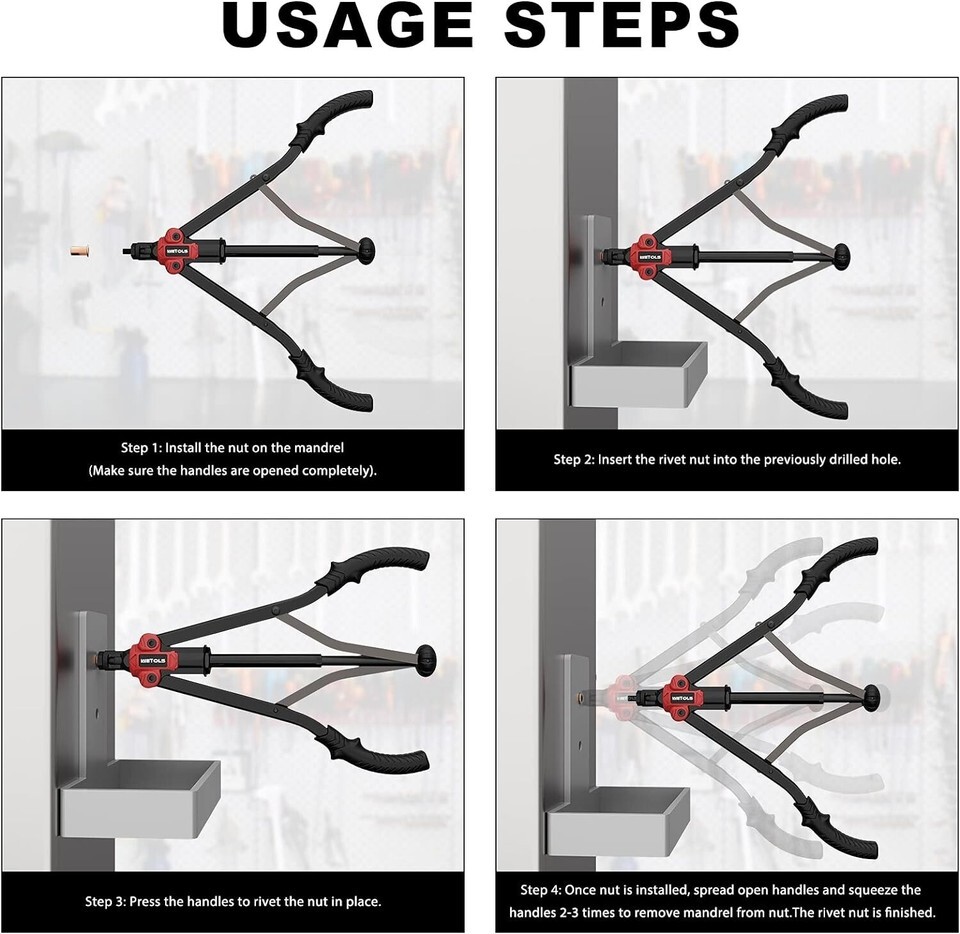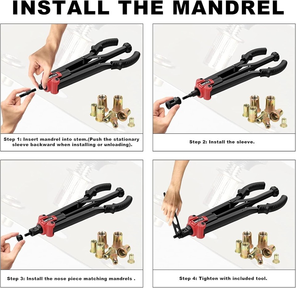 High-quality Design: 17" handles, max multiple of arm forced 45; Delicate shape, ergonomic hand; Handle connecting rod design, quick release nut structure. Its design makes it easier to rivet nut. In addition, when the nut riveting is completed, the open handle automatically exits the nut. No need to manually unscrew. It saves a lot of time and makes the operation simple and convenient