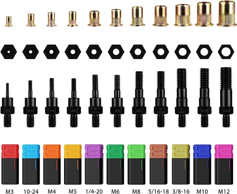 Complete Accessories: 11PCS Metric and SAE interchangeable mandrels(Metric M3 M4 M5 M6 M8 M10 M12; SAE 10-24, 1/4-20, 5/16-18, 3/8-16) , 110pcs rivet nuts, a multi-function wrench, and a sturdy carrying case. All the tools and accessories can be placed in case. Easy to carry and accessories are not easy to lose