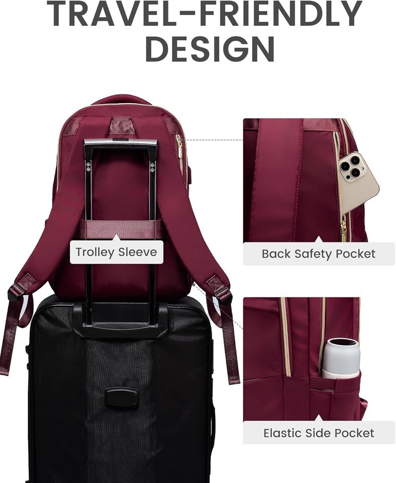 CONVENIENT LUGGAGE STRAP DESIGN- A luggage strap allows the backpack to fit on luggage/suitcase, slide over the luggage upright handle tube for easier carrying, it helps you free your hands and back from the burden. Anti-theft pocket on the back protects your valuable items from thieves