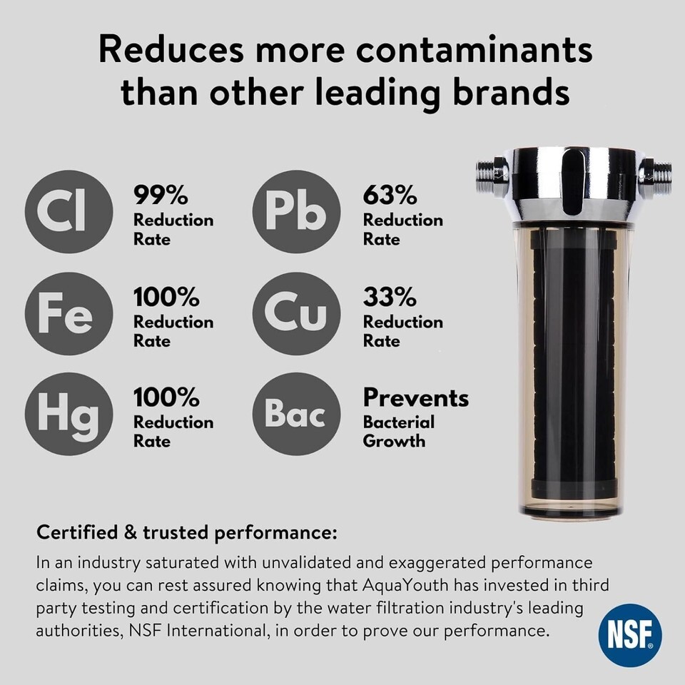 CERTIFIED TRUSTED PERFORMANCE: In an industry saturated with unvalidated performance claims, you can rest assured knowing that has invested in third party testing and certification. The shower filter is the only shower filter on the market that is NSF/ANSI 177 certified for the reduction of Free Available Chlorine and NSF/ANSI 372 certified for Low Lead Content Verification and confirmed the reduction of heavy metals by Korea Environment Water Works Institute.