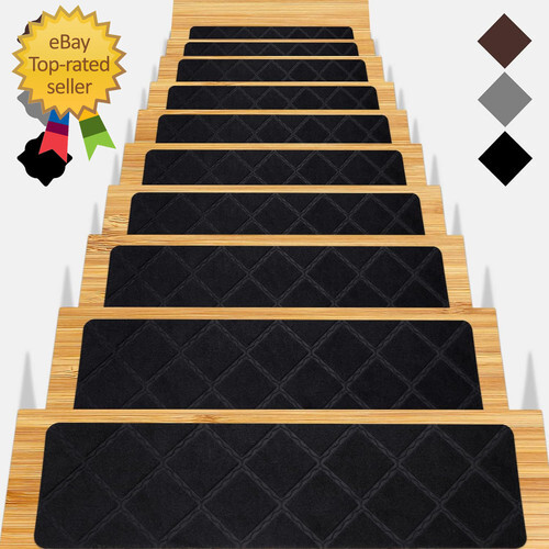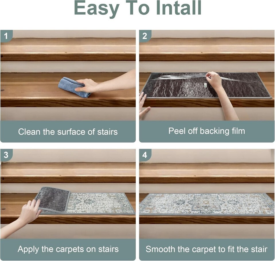 ?Easy to Install and Remove?These stair treads for wooden steps are easy to install, no double-sided tape, glue or carpet tacks are required. Steps: 1. Clean the stairs for better adhesion. 2. Tear along the seam between the protective film and the edge. 3. Peel and stick stair treads, smooth with your hands, and press the corners for a few minutes to keep them from curling. Removal is simple: just pull gently to remove, leaving no residue or damage, making or cleaning easy