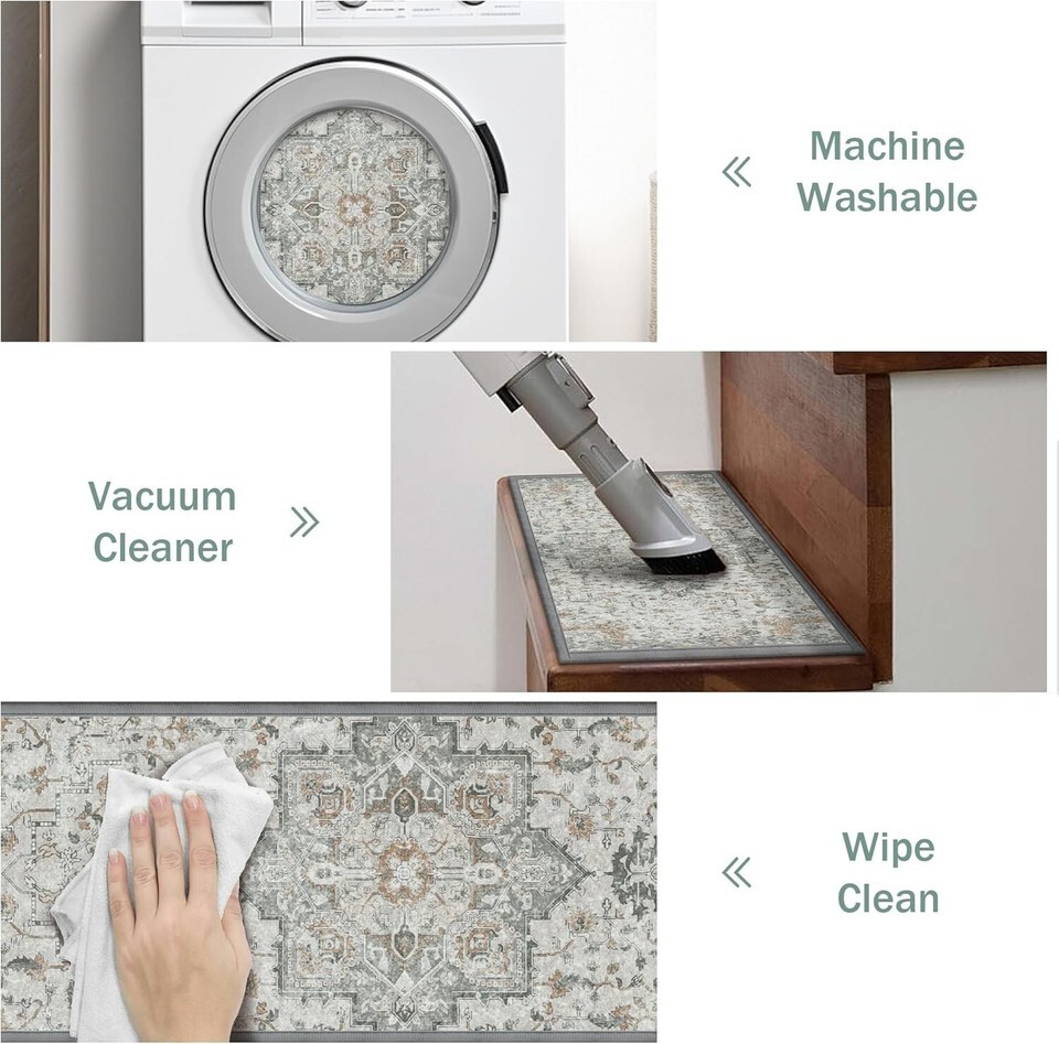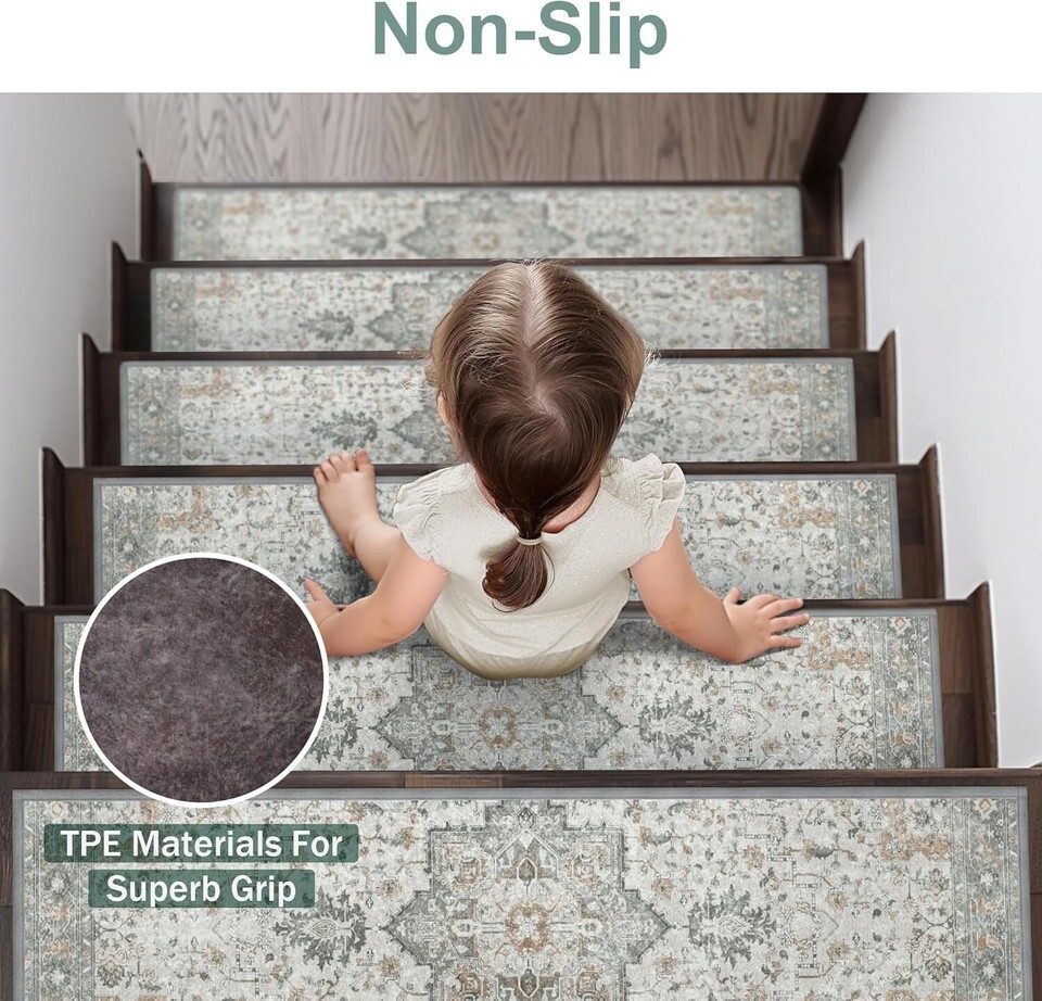 ?CLEANABLE REUSABLE?Stair carpet rug is easy to clean and supports both machine and hand washing, effortlessly removing stains without the need for special detergents. Regular vacuuming with a vacuum cleaner or a quick wipe will keep your carpet looking fresh. Made from long-lasting materials, these non-slip stair carpet treads retain their original color and softness even after multiple washes, but please do not use bleach