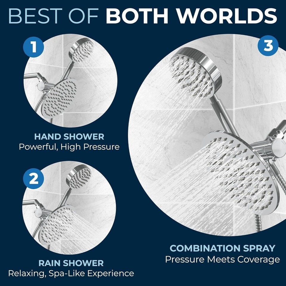 ALL METAL Dual Shower Head Combo ? CHROME ? 8 Inch Rainfall High Flow Shower Head 3-Flow Handheld Shower Head High Pressure with Hose 6ft - Luxury Double Shower Heads