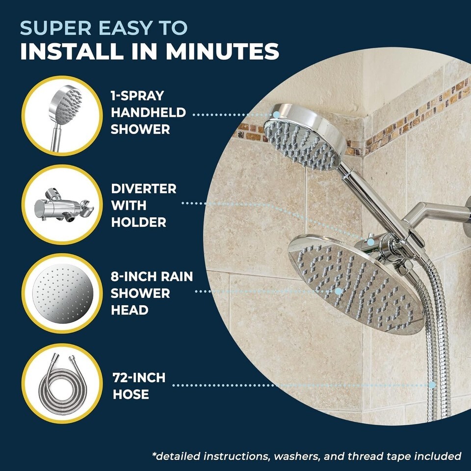 HOTEL CALIBER LUXURY AT HOME Immerse yourself in warm, relaxing water with the big 8 INCH RAIN SHOWER HEAD while enjoying 3 SPRAY OPTIONS on multi-function shower head with handheld sprayer ? WIDE SPRAY, MASSAGE, or MIST.