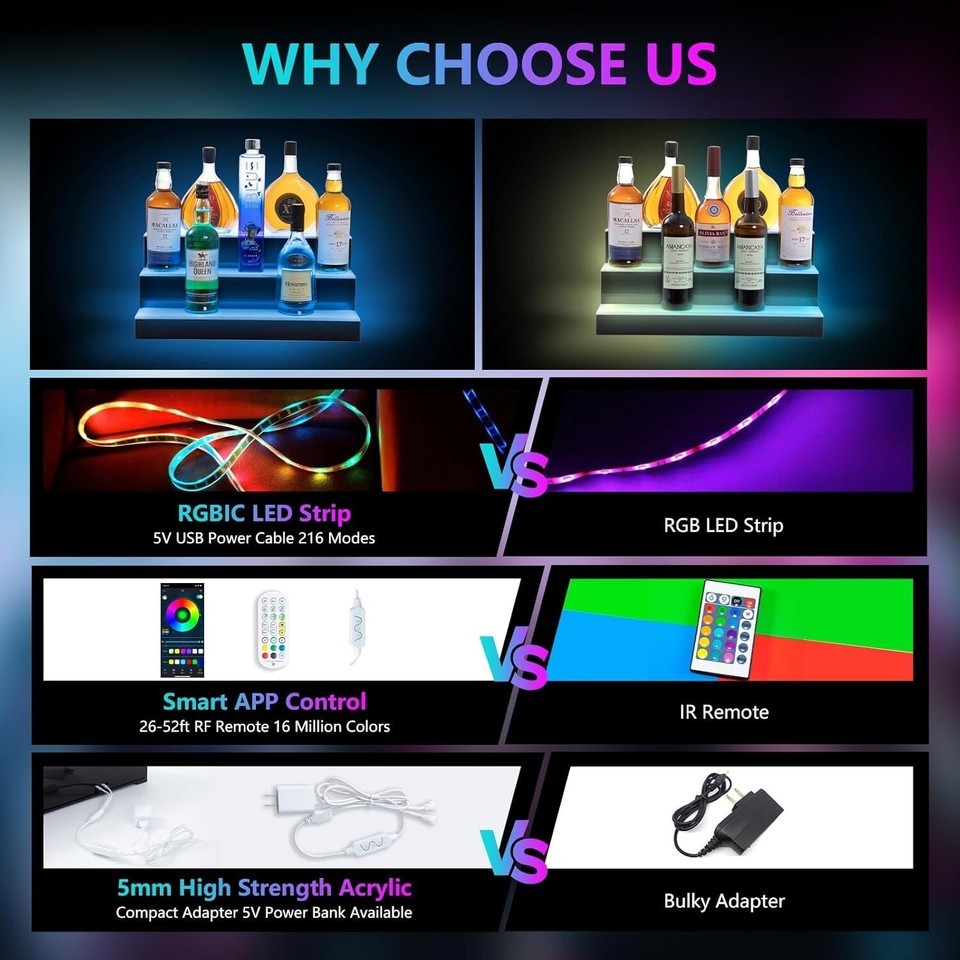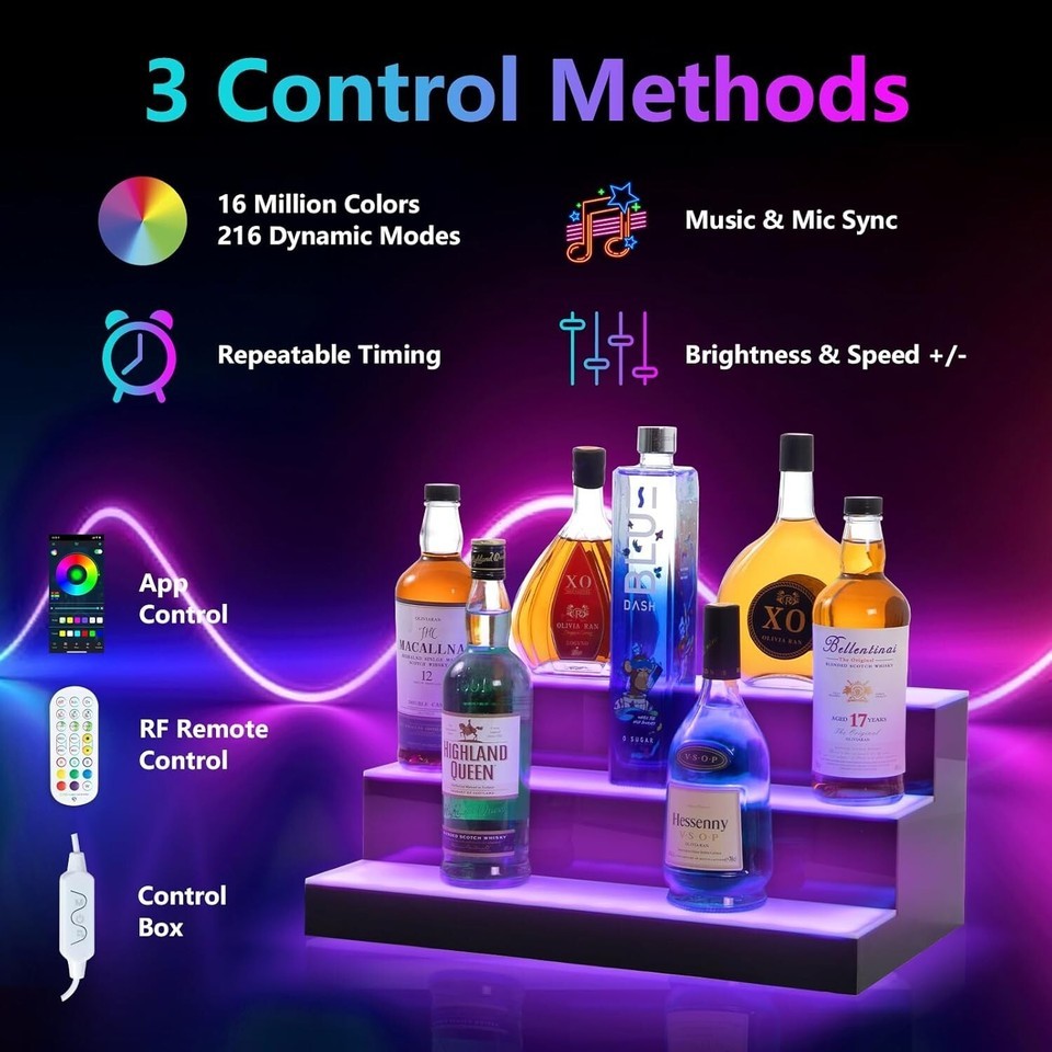 Led Lighted Liquor Bottle Display Shelf, 20 Inch 3 Tier Whiskey Rack, Support USB, Bar Stand with RF Remote App Control, Illuminated Acrylic Lighting Shelves for 18 Bottles, Home Bar, Party