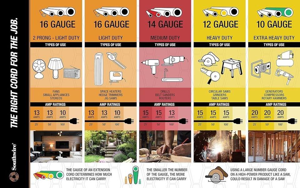 HEAVY DUTY EXTENSION CORD REEL holds up to 50-ft of 12 gauge cord; 70-ft of 14 gauge cord; or 90-ft of 16 gauge cord