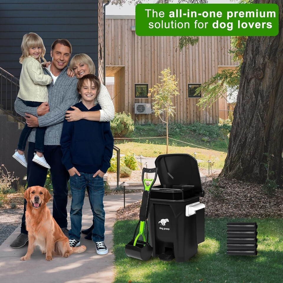 Dog poop trash can, the all-in-one solution , suitable for your yard, home use, eliminating all stains, making life more comfortable. · High-quality Foldable Pooper Scooper, easily handling garbage in lawns,space-saving storage when not in use. · 100 high-quality garbage bags are prepared for you, sufficient for your two- needs. · Large-capacity sealed trash can with a lid, can hold a week?s worth of yard waste, isolating odors and ensuring a clean and fresh yard. · Trash bag storage box,:allows for easy access to garbage bags at any time.