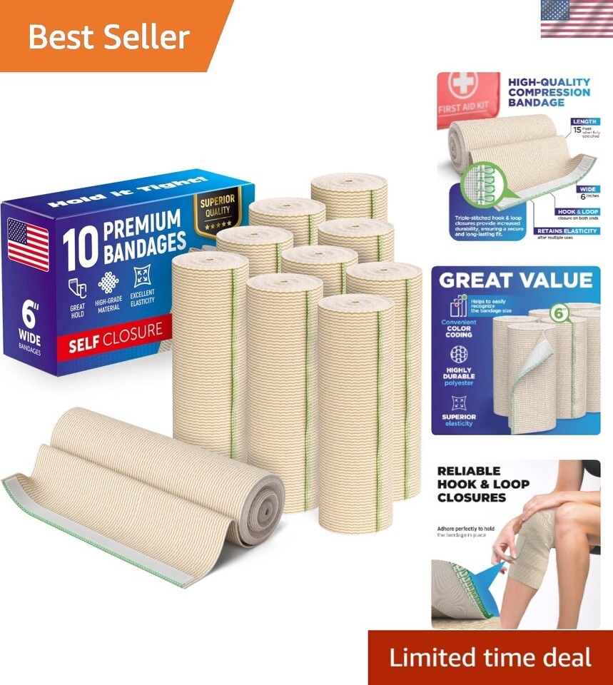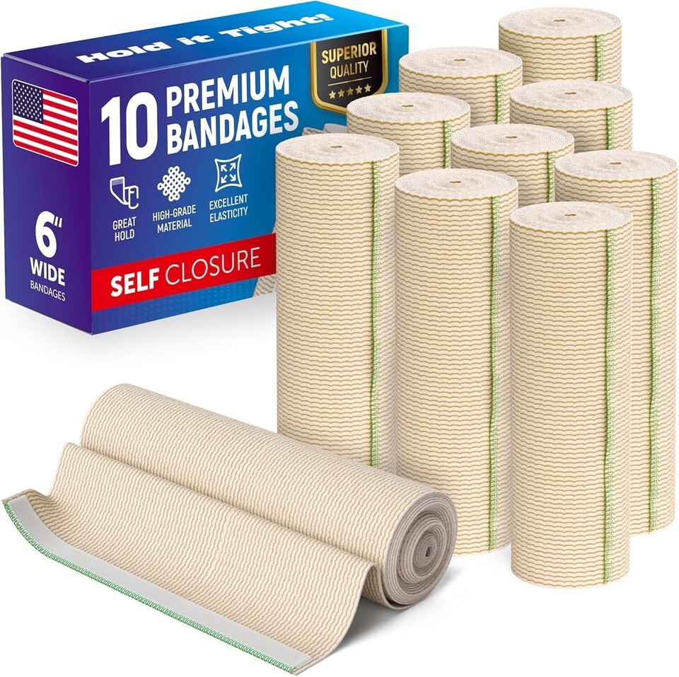6? Premium Elastic Bandage Wrap - 10 Pack - Hook Loop Closures - Wide Compression Bandage Wrap - Waist, Legs, Knee, Lymphedema, Body Wrap