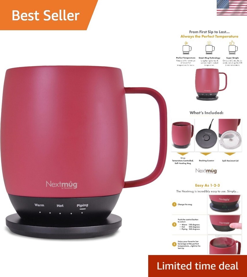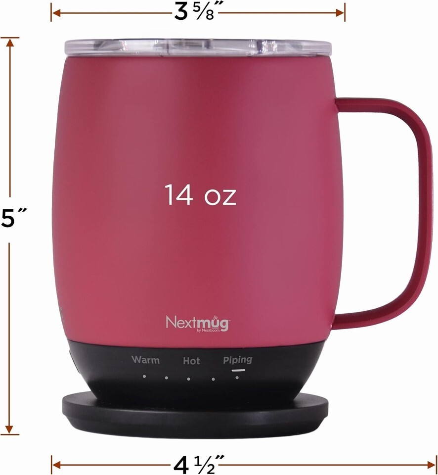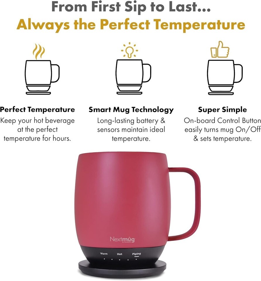 ALWAYS THE PERFECT TEMPERATURE ? The Nextmug will keep your hot coffee, tea or preferred beverage at the perfect temperature wherever you are. Simply select Warm (130), Hot (140), or Piping (150) and enjoy for hours.