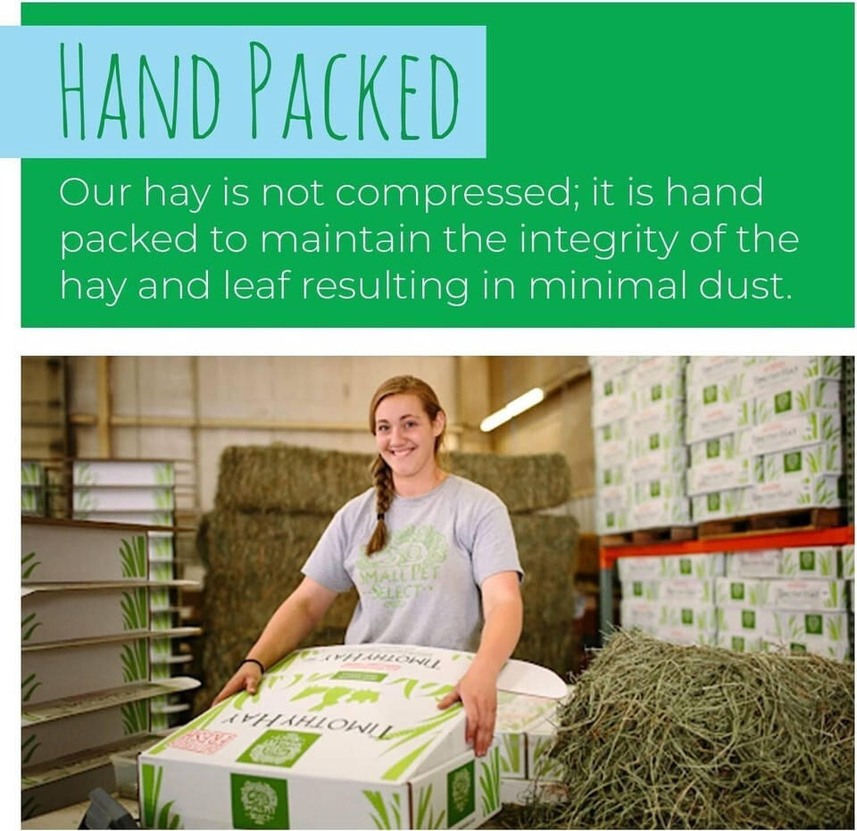 Hand-Selected Timothy Hay - We hand-pack each box in small batches to ensure only the highest quality 100% US-grown 2nd cut Timothy hay arrives at your door. 2nd cut Timothy hay is a perfect balance of stem, seed head , and leaf to provide the rough fiber needed for normal wear to healthy teeth and yummy features with a fresh smell to keep them coming back for more.