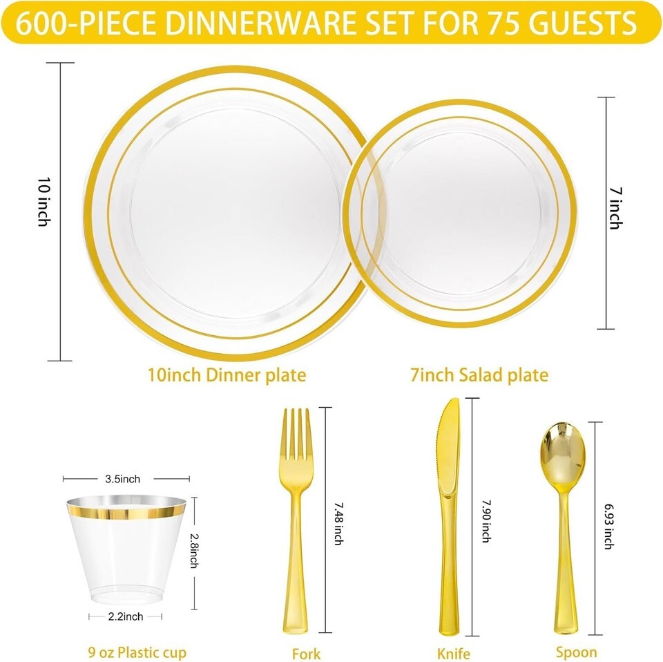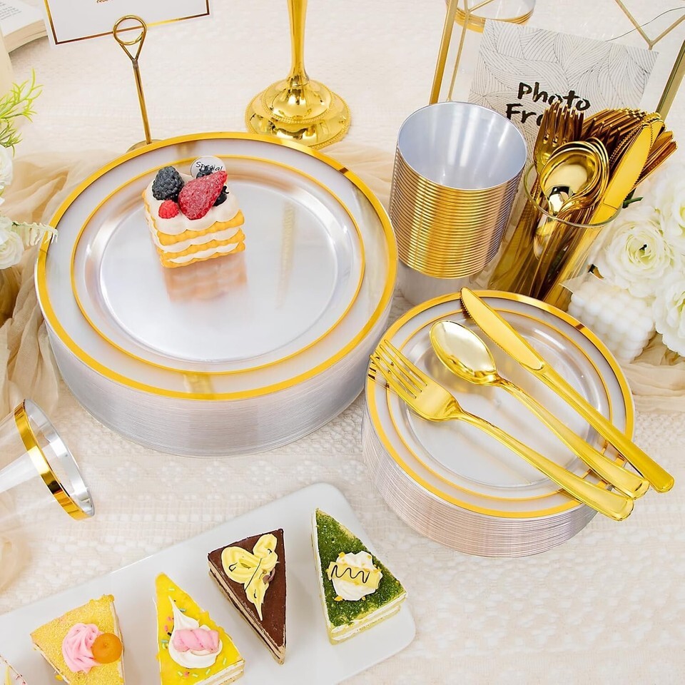 Disposable and Hassle-Free: With these 100 guests plastic dinnerware set of clear gold plastic plates, cups, knives, forks, and spoons, you can host a party without the worry of cleanup. Simply dispose of the used items after the event, eliminating the need for time-consuming washing