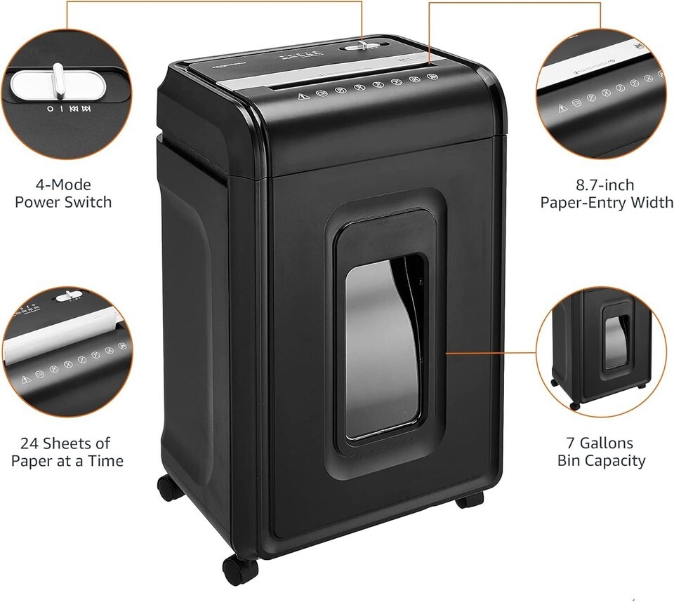 4-mode power switch (auto, off, reverse, forward); auto start and anti-jam auto reverse to minimize/clear paper jams; LED indicators (bin full, door open, overload, overheat, power on); paper-entry width; easy-to-empty 7-gallon pull-out bin; casters included