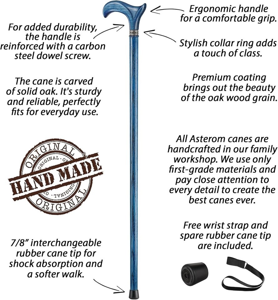 Our wooden canes for men are carved from hardwood oak, smooth sanded by hand, and finished with high-quality Italian coatings. The ergonomic derby handle is reinforced with a heat-treated screw, ensuring that this walking cane can withstand up to 300 pounds of weight when the main load is applied to the cane shaft.