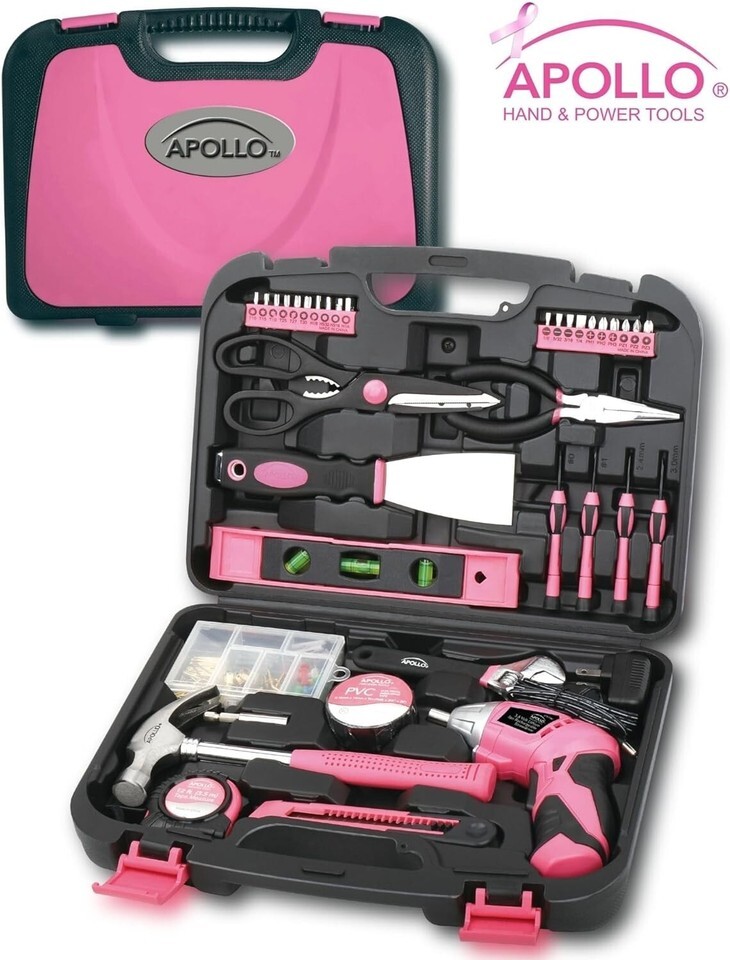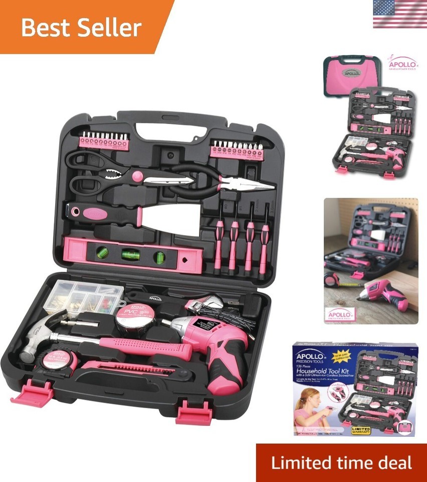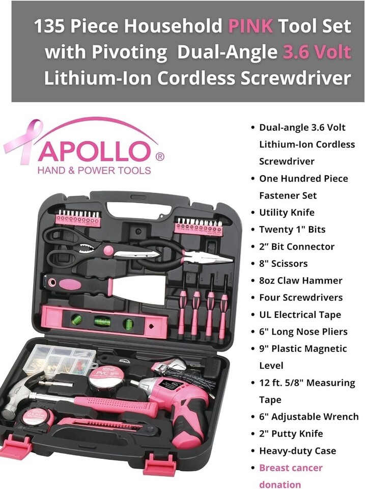 HOME DIY TOOL KIT: Whether you're hanging pictures in your new home or assembling a television stand in a dorm room, this kit puts everything you need for light- and medium-duty projects and repairs at your fingertips. This set includes tools carefully chosen for their usefulness in everyday household and DIY tasks so you will always have the right tool for the job. Tools are neatly stored in a sturdy case that keeps them secure, clean, organized, and easy to find. The case is easy to carry with its built-in handle; your tool kit can come with you wherever it is needed. THE UPGRADED VOLT LITHIUM-ION RECHARGEABLE SCREWDRIVER packs a punch and is the perfect time-saving assistant. This powerful cordless screwdriver with forward/reverse mechanism allows for rapid tightening and loosening of screws. It features a bright LED to light up work areas. The power gauge lets you know when it?s time to recharge. CORDLESS SCREWDRIVER ANGLE ADJUSTMENT. For a more convenient reach depending on the situation, this cordless screwdriver's head has a useful pivoting feature. Push a button and the head rotates from straight to right angle. USEFUL HAND TOOLS: The set includes useful tools such as a claw hammer, adjustable wrench, long nose pliers and precision screwdrivers. It also comes with accessories to help you with your DIY and decorating tasks such as a putty knife for filling and smoothing holes and cracks in flat surfaces, a 100 piece wall hanging kit includes a wide assortment of pins, hooks and nails, a level and a tape measure will make sure the position and angle is perfect. Our hand tools are drop forged for strength; chrome plated to resist corrosion and have non-slip comfort grip handles for extra torque, and will last a under normal use. TOOL SETS ARE AN IDEAL GIFT IDEA and this particular set is a people pleaser. Tool sets make for a thoughtful housewarming gift, an original shower gift, a useful Christmas gift or graduation gift. Parents find it an empowering gift to give children as they leave the nest. Some of our customers are so happy with our pink tool set that they have given them as gifts time and time again. CANCER RESEARCH DONATION. A cause dear to our heart at Tools, we wanted a portion of every purchase to go directly to help breast cancer research. 1 dollar out of every purchase of this handy tool kit goes directly to benefit breast cancer research and cure. Contains: Dual-angle Volt Lithium-Ion Cordless Screwdriver One Hundred Piece Fastener Set 18mm Utility Knife Ten 1" Bits CRV (1/8", 5/32", 3/16", 1/4", PH1, PH2, PH3, PZ1, PZ2, PZ3) Ten 1" Bits CRV (T10, T15, T20, T25, T27, T30, 1/8", 5/32", 3/16", 1/4") 2? Bit Connector 8" Scissors 8oz Claw Hammer Four Screwdrivers (Phillips No. 1, No. 0, Slotted , mm) UL Electrical Tape 6" Long Nose Pliers 9" Plastic Magnetic Level 12 ft. 5/8" Measuring Tape 6" Adjustable Wrench 2" Putty Knife .com The Precision Tools 135-Piece Household Pink Tool Kit is a fun, versatile array of tools for small household projects. Featuring a charming pink color scheme and a rugged carrying case, this tidy, multipurpose kit is ideal for a wide variety of general household projects. Tools in the kit, including a steel claw hammer, a utility knife, an adjustable wrench and pliers amongst others, are heat treated and chrome plated for long-lasting durability. Each tool is tested against industry standards for hardness, torque, finish and usability and should last a under normal use. All the Tools You Need For Small Household Projects