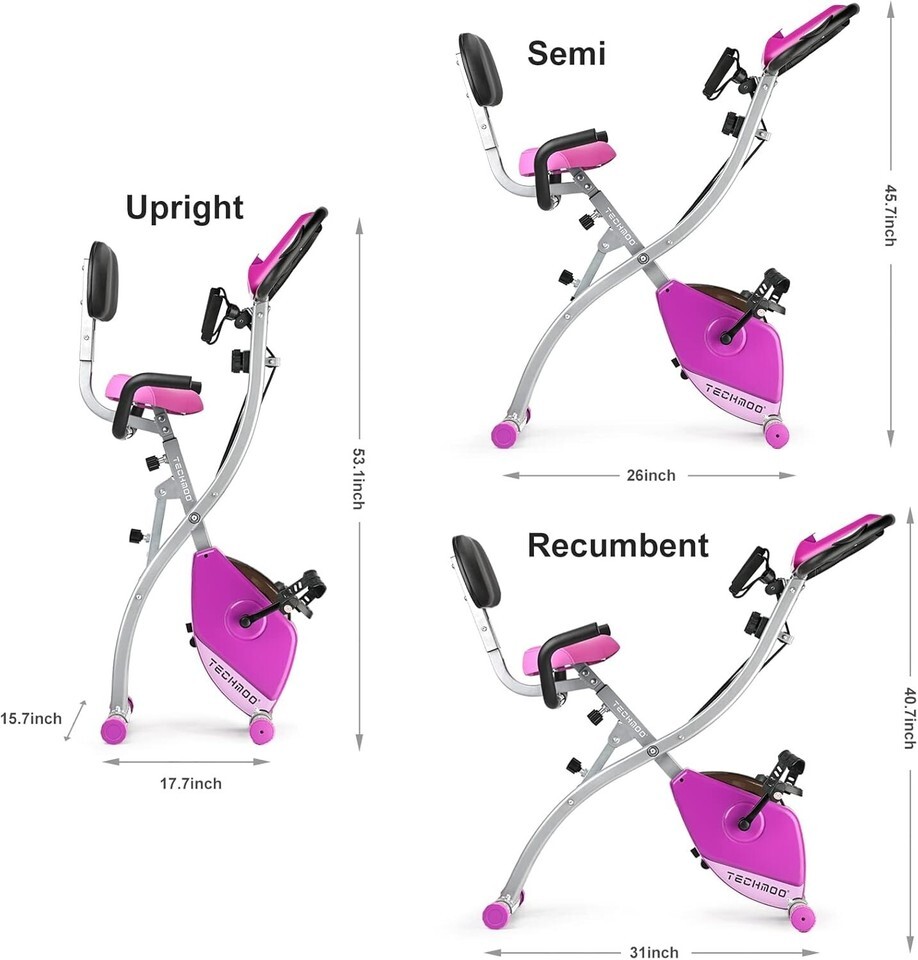 3-IN-1 Exercise Bike: It can be changed into Upright, Semi-Recumbent and Recumbent Foldable Stationary Bike. The upright exercise bike helps boosts your heart rate and improve your cardio fitness. While the recumbent exercise bike is more comfortable and natural reclined body position which help reduce body fatigue and eliminate muscle soreness in the upper body.