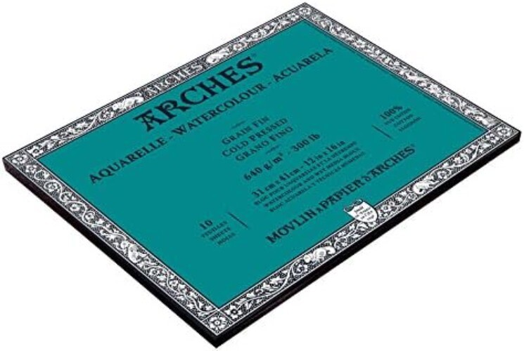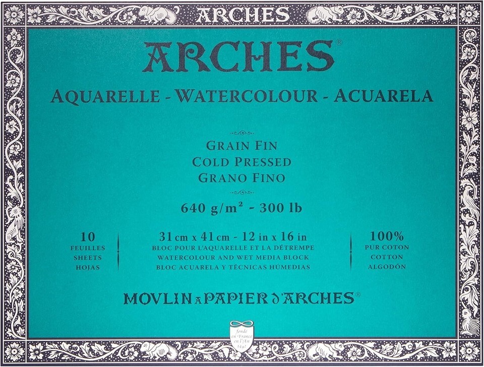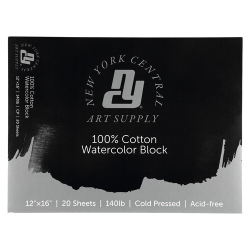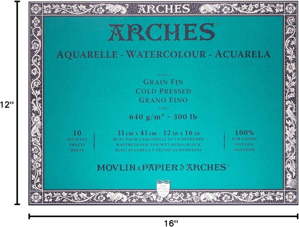 Watercolor Blocks contain paper made with natural cotton fibers on a cylinder-mold machine. This artist-grade watercolor paper is great for watercolor, gouache, acrylic, and airbrushing. is made with a natural gelatin sizing. These blocks contain 10 sheets of natural white, acid free, 100% cotton paper, and are glued on all 4 sides. This block is 12"X16" cold press 300lb / 640g.