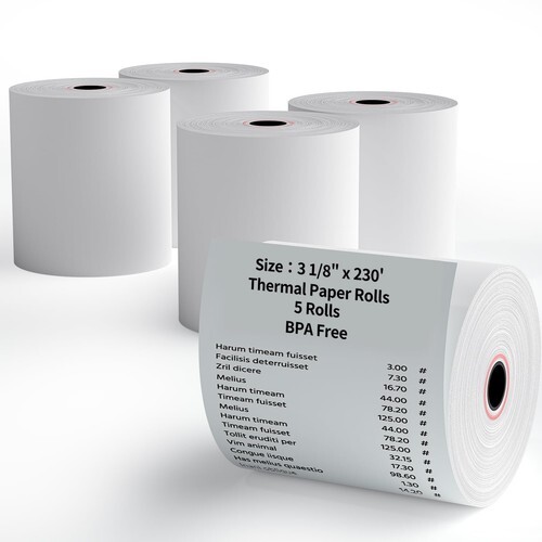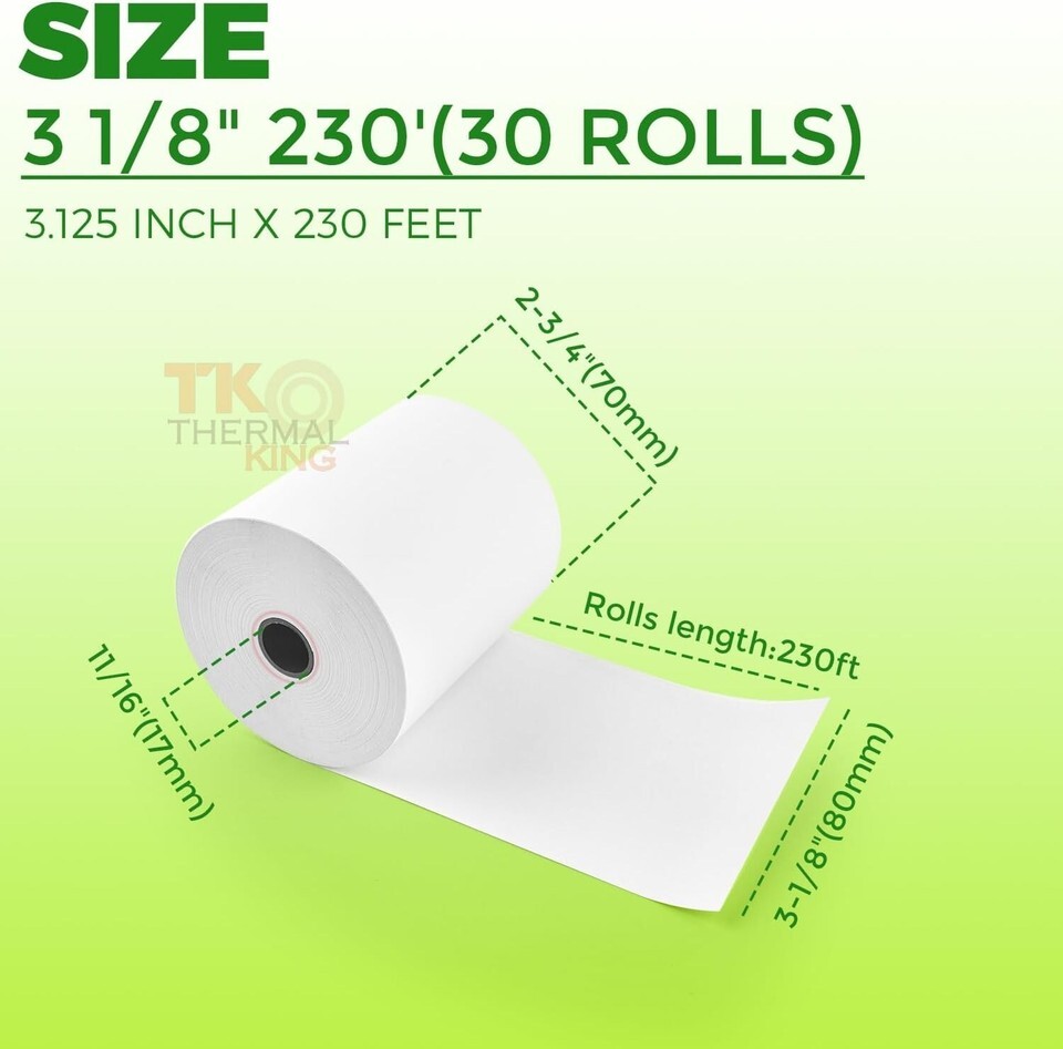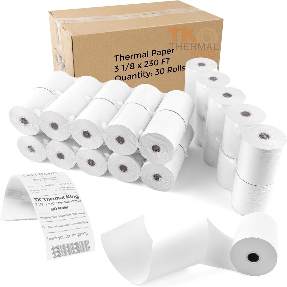 30 Rolls 3 1/8" 230' feet White Thermal Paper Cash Register POS Receipt, Fits All Credit Card Terminal Great For Credit Card Paper