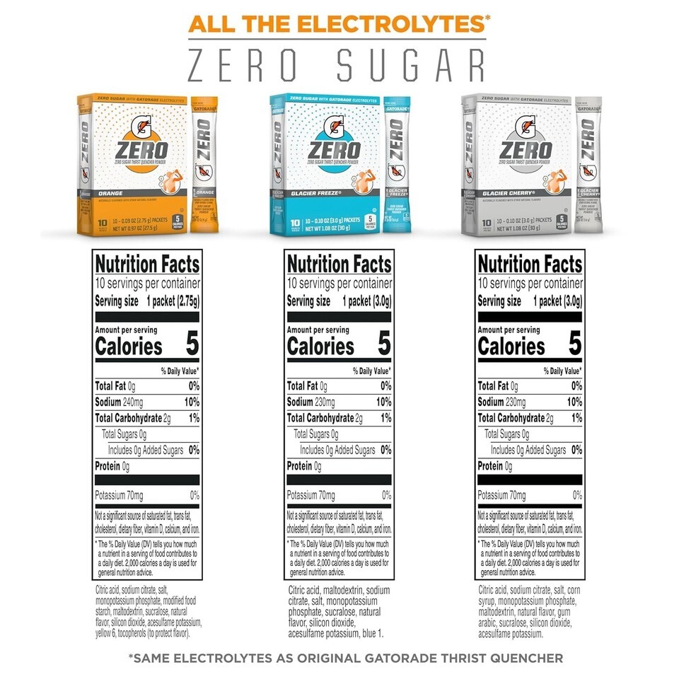 When you sweat, you lose more than water. Losses in fluids and electrolytes can negatively impact performance. Zero contains critical electrolytes to help replace what?s lost in sweat