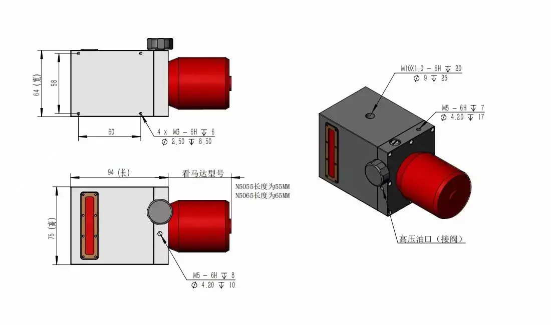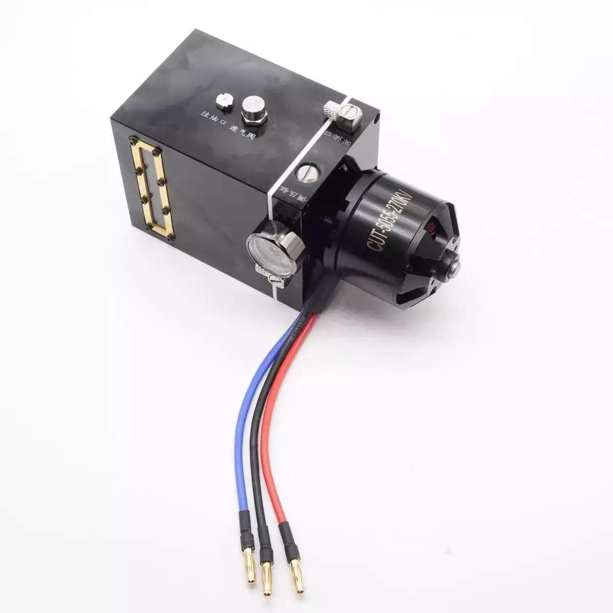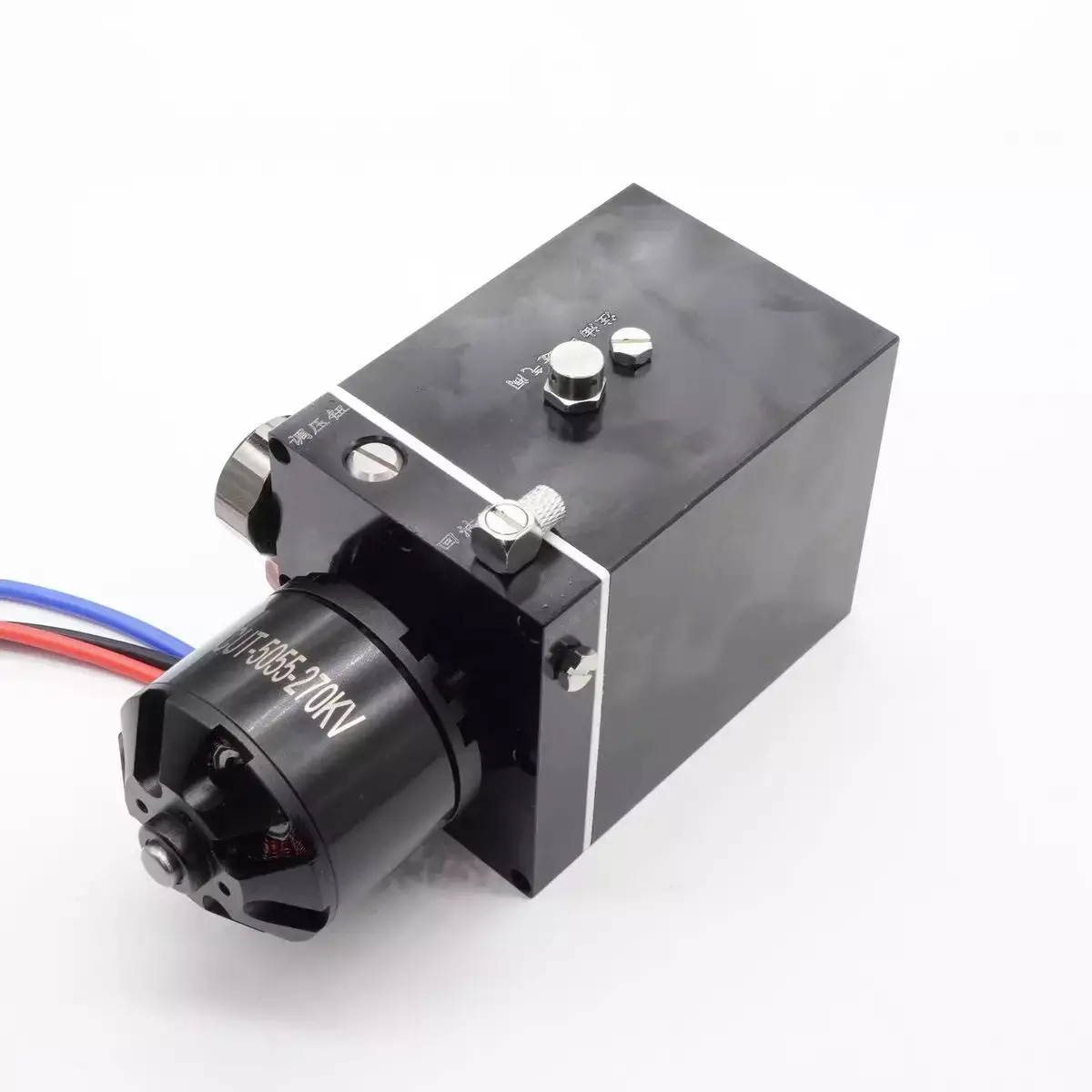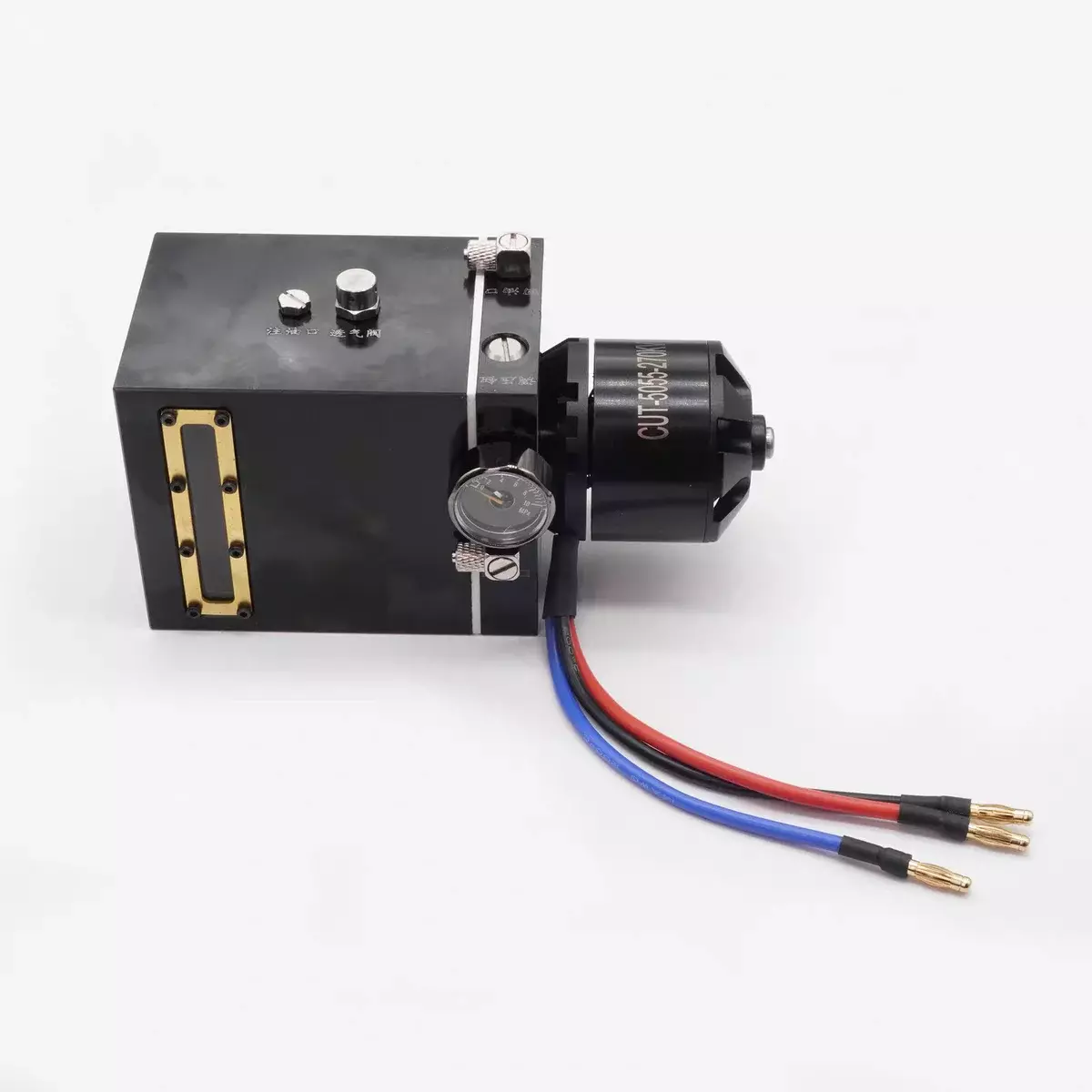 The integrated pump is a hydraulic unit that integrates the oil pump oil pipe oil tank pressure regulating valve and hydraulic gauge. It saves a lot of space has a compact structure and has excellent performance. It is easy for novice players to get started. The pump head uses an Italian pump head the motor uses a 5055 high-power brushless motor and the oil tank is made of a whole piece of aluminum alloy CNC hollowed out. The workmanship is incomparable to that of aluminum square tube cutting. The total weight of the product is 1300 grams which is very heavy. There are two return ports namely return port 1 and return port 2 as shown in the figure. If you use return port 1 please use M5 plug to plug return port 2 at the same time. The same is true for the reverse valve. The oil outlet is connected to the reversing valve and the reversing valve oil outlet is connected to the return port