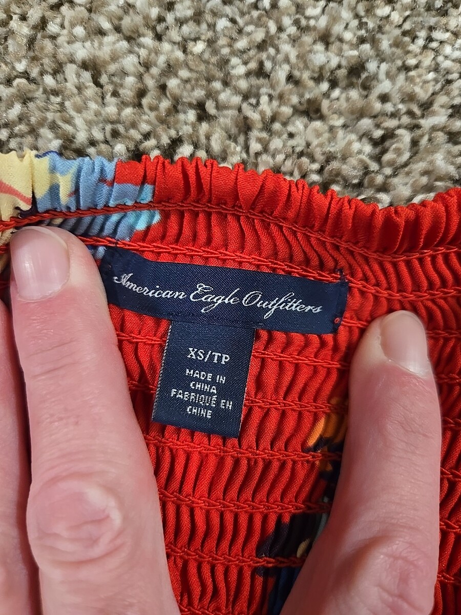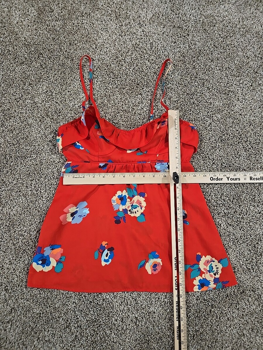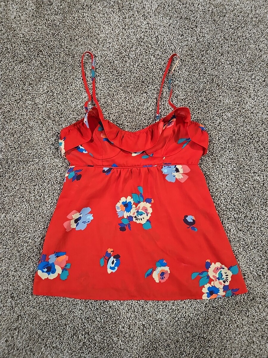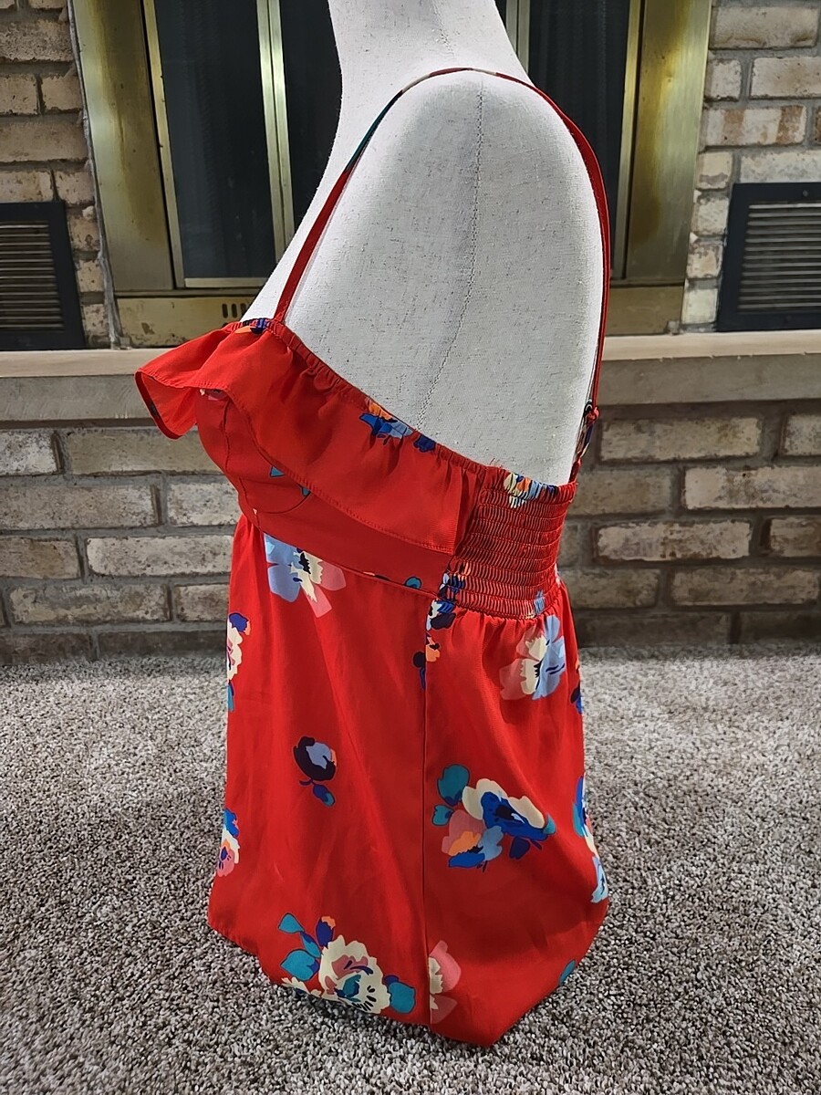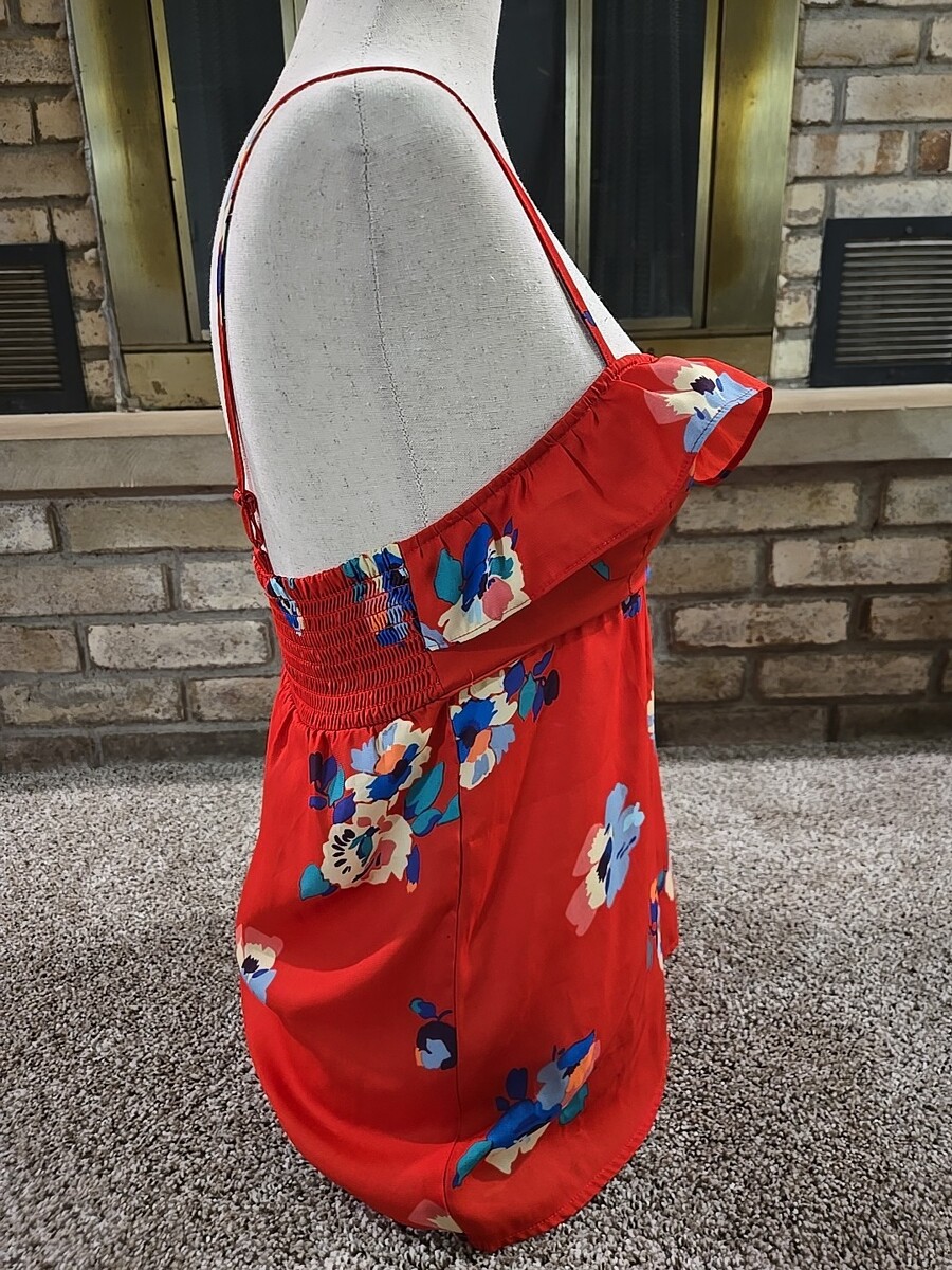 The American Eagle 2012 Floral Spaghetti Strap Sleeveless Blouse Top in women's size XS is a stylish and trendy piece perfect for a party or casual outing. With a beautiful floral pattern, red color, and ruffle accents, this blouse exudes a bohemian, tropical, and preppy vibe. Made of polyester and featuring a slim fit, adjustable straps, and a pullover closure, this blouse is easy to care for with a hand wash only requirement. Ideal for the summer, fall, and spring seasons, this top from American Eagle Outfitters is a versatile and chic addition to any wardrobe.