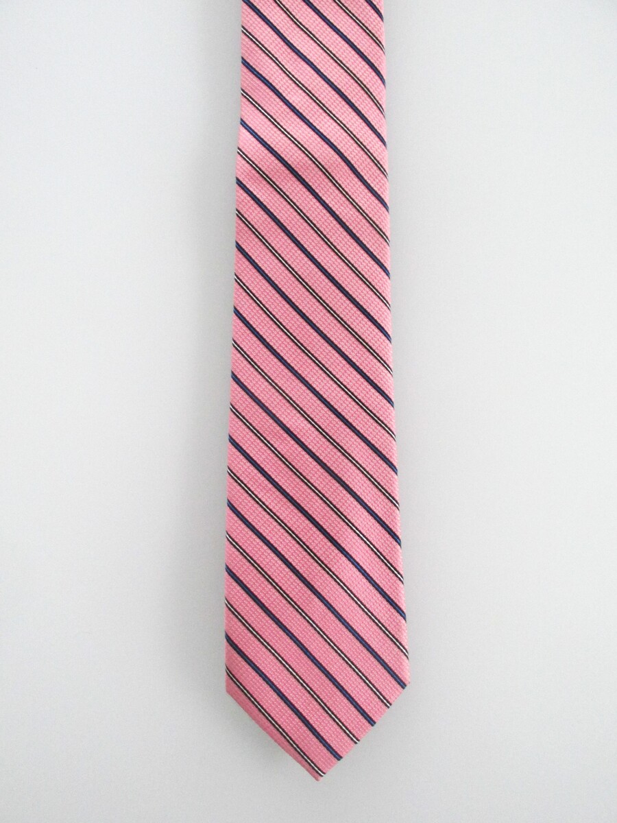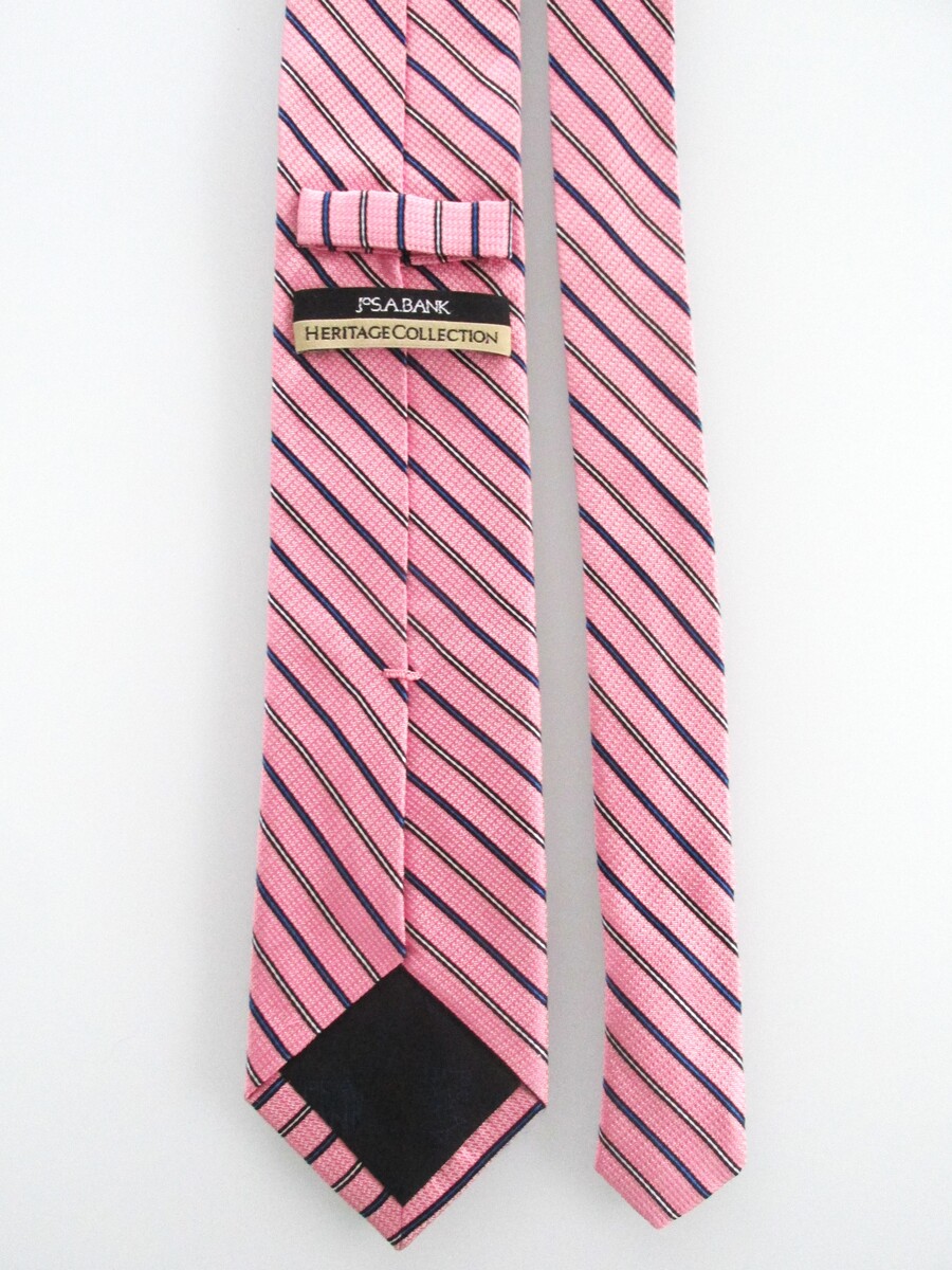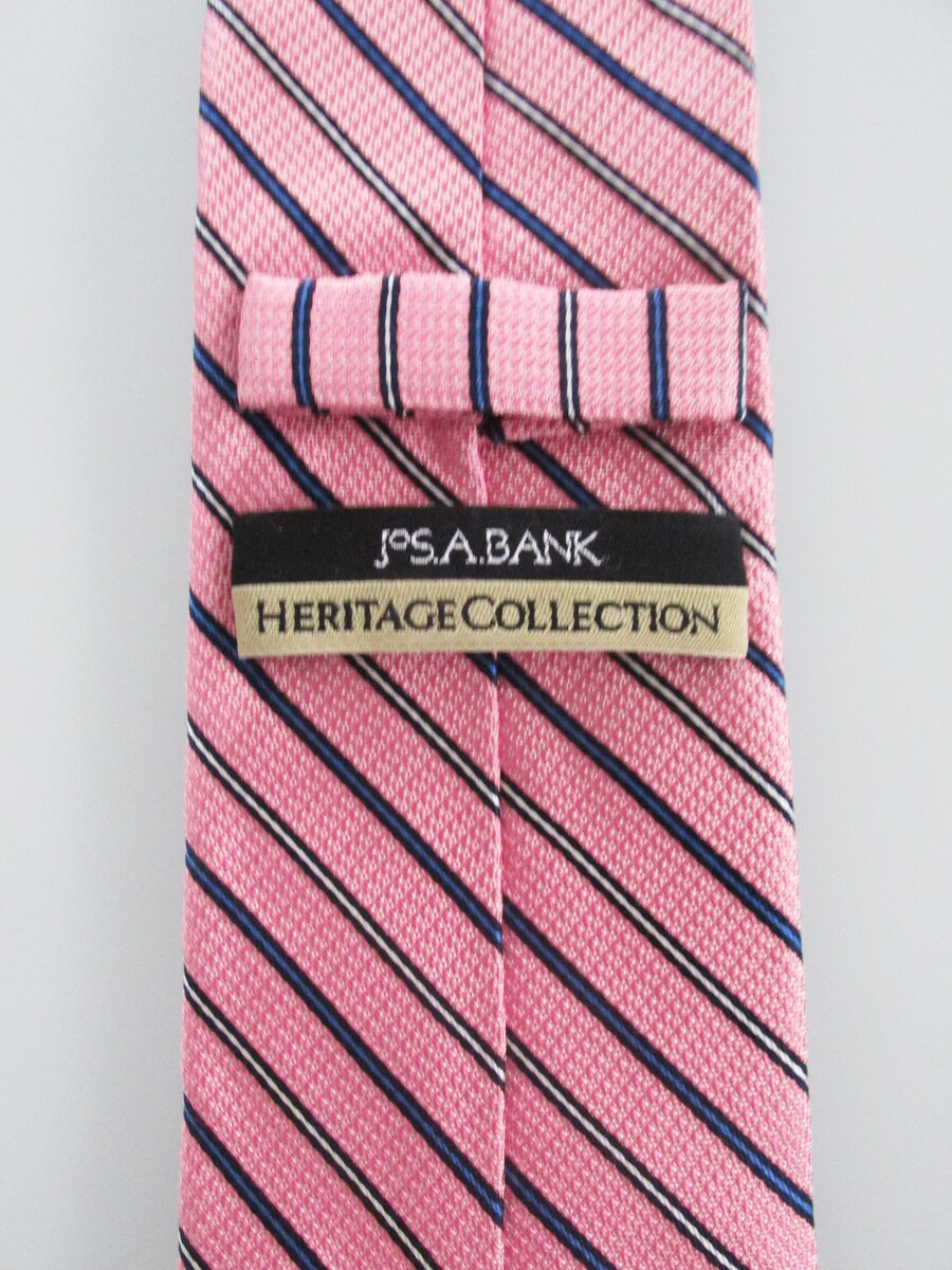 Description: Up for sale is a Jos. A Bank (Heritage Collection) men's slim silk tie. This tie is handmade of 100% silk. It has a multicolored striped pattern in navy blue silver on a medium pink patterned background. Dimensions are approximately 58" long x 3.00" wide. This tie is in like new condition.