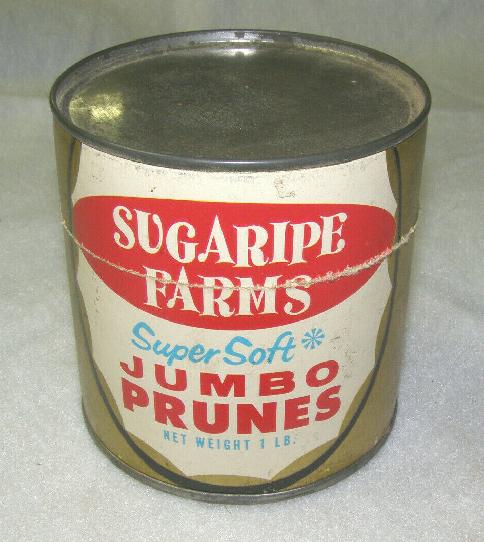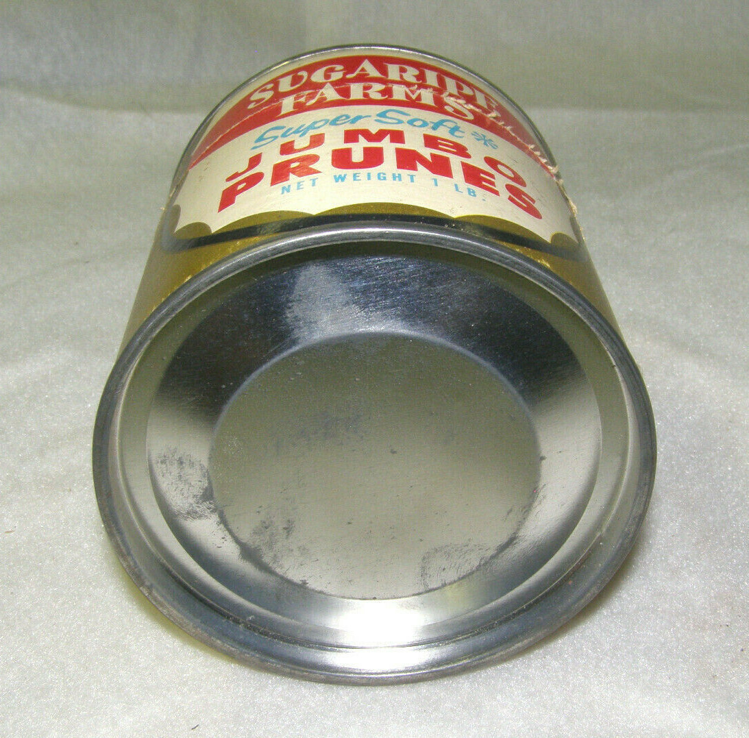 VINTAGE SUGARIPE FARMS ADVERTISING FOOD TIN CANISTER “JUMBO PRUNES”-1 LB- CA,USA