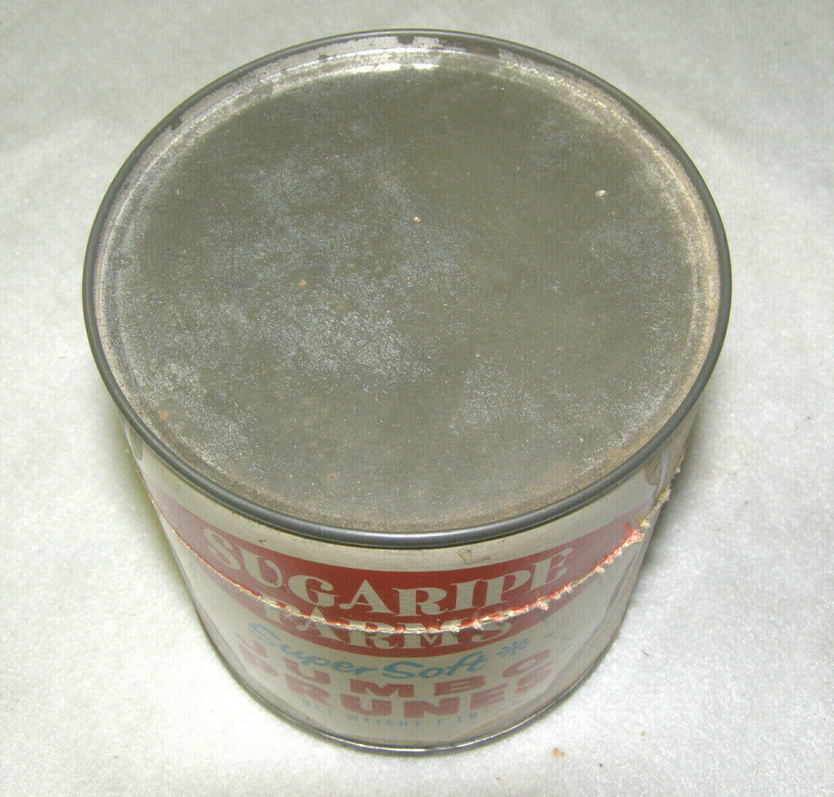 VINTAGE SUGARIPE FARMS ADVERTISING FOOD TIN CANISTER ?JUMBO PRUNES?, 1 LB. CONTAINER - SAN JOSE, CALIFORNIA